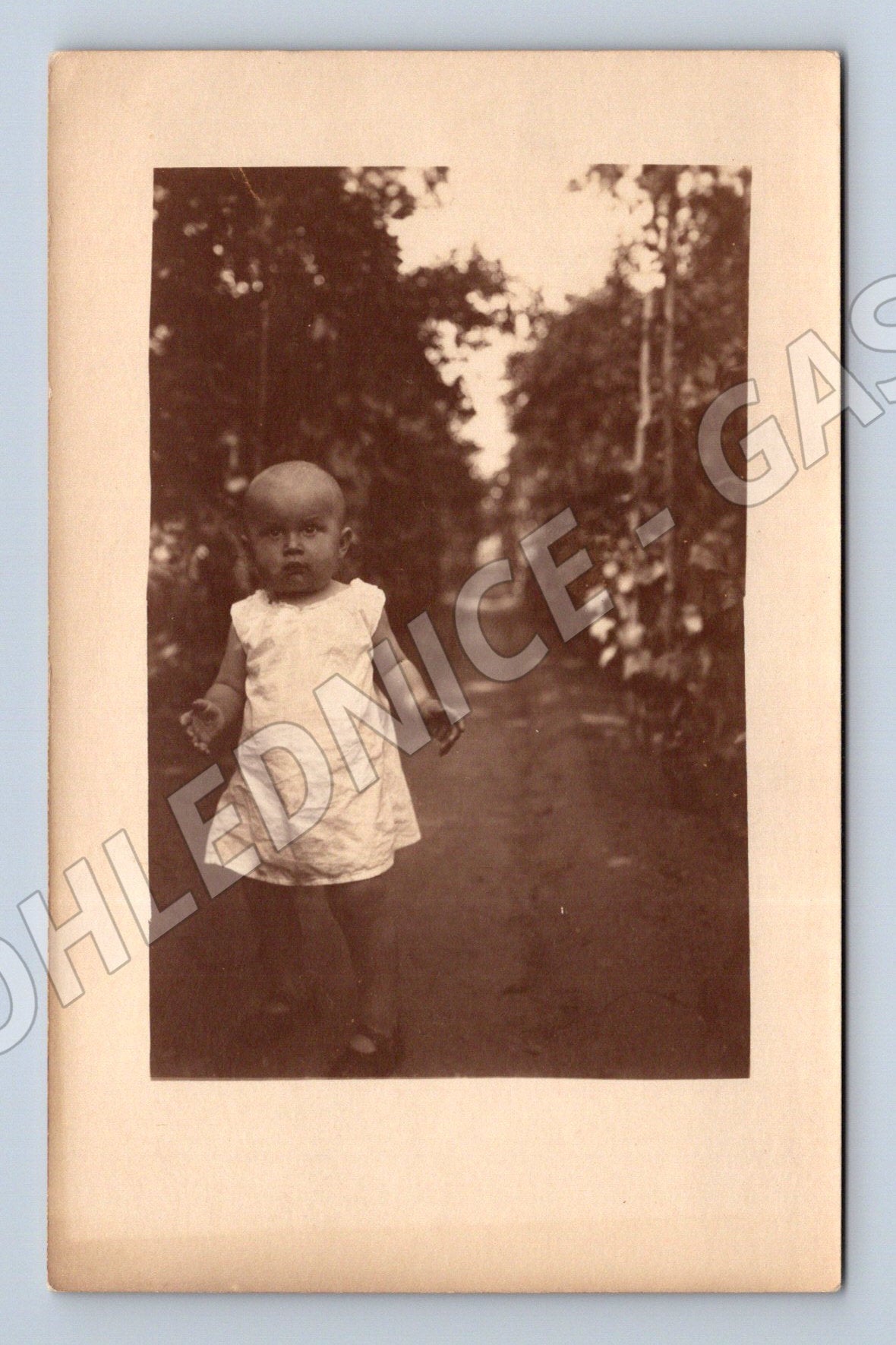Starší černobílá pohlednice s portrétem malého dítěte ve světlých šatech. Pohlednice pravděpodobně pochází z první poloviny 20. století, což je patrné ze stylu fotografie a úpravy okrajů. Zadní strana pohlednice je nevyplněná, bez textu a známky, pouze s tištěným číslem 171 a ručně psaným označením H 3676. Pohlednice je vhodná do sbírky historických portrétů nebo jako dekorativní retro kousek. Stav viz foto – mírné známky stáří, lehce zahnědlé okraje.