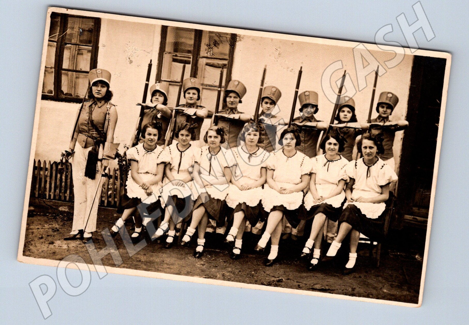 Originální stará černobílá pohlednice zachycující skupinu mažoretek v uniformách a sukních před budovou, zřejmě z českého prostředí. Jedná se o malý formát pohlednice (klasický rozměr používaný do roku 1950). Zadní strana je nepopsaná, s typickým dělením na adresní a textovou část. Pohlednice nese známky stáří, jemné patiny a lehkého opotřebení odpovídající věku. Skvělý sběratelský kousek pro milovníky retro fotografií, etnografie a historie Česka.