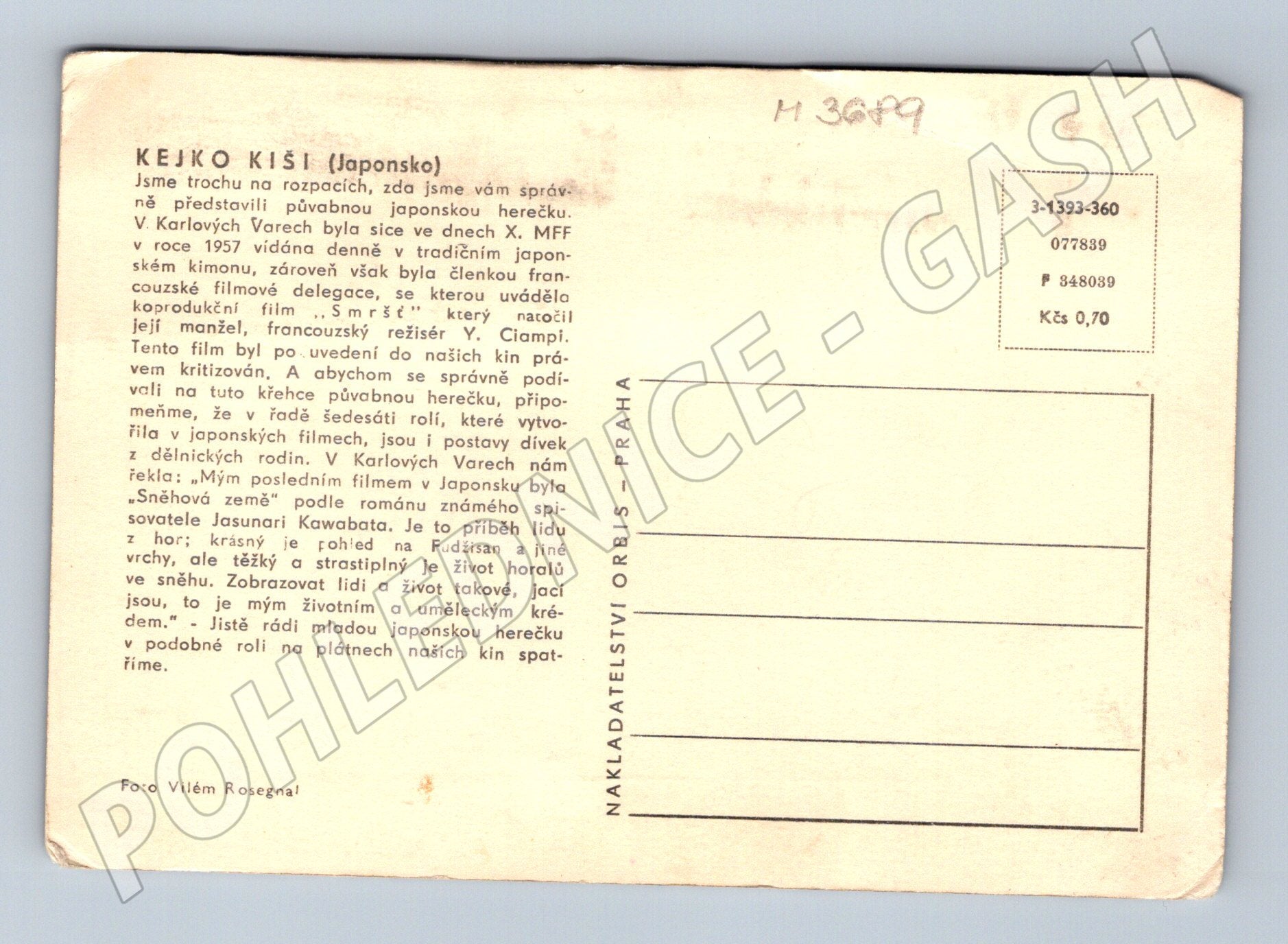 Nabízím originální sběratelskou pohlednici s japonskou herečkou Keiko Kishi. Pohlednice byla vydána nakladatelstvím Orbis - Praha a nafotil ji Vilém Rosegnal. Na zadní straně najdete podrobný popis hereččina působení v Karlových Varech během X. Mezinárodního filmového festivalu v roce 1957 i zmínku o její kariéře v japonské a francouzské filmové produkci. Herečka se zde představuje v tradičním japonském oděvu kimono, fotografie působí velmi elegantně a nostalgicky. Pohlednice je v dobrém sběratelském stavu, jemné opotřebení na hranách odpovídá stáří a zachovalosti materiálu. Formát pohlednice je klasický, velmi zajímavý doplněk do sbírky pohlednic osobností nebo japonské kultury.
