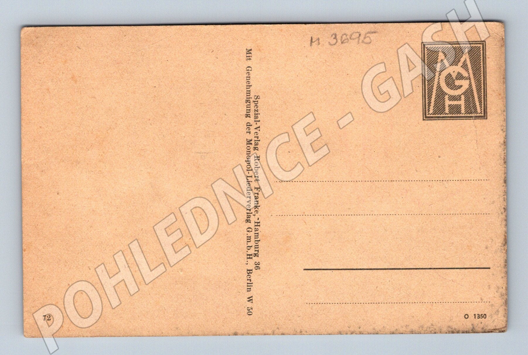 Originální historická pohlednice z Německa, zobrazující portrét ženy a text populárního valčíku Bei der blonden Kathrein! (Walzerlied von Leo Leux). Na lícové straně najdete jak fotografii, tak i celý text písně. Zadní strana je neprošlá, s označením vydavatelství Spezial-Verlag Robert Franke, Hamburg a licencí Monopol-Liederverlag GmbH, Berlin. Pohlednice má dobovou patinu a drobné známky stáří, vhodná pro sběratele pohlednic s tematickou německou kulturou a historií. Formát klasický, tisk kolem roku 1930–1940. Výjimečný sběratelský kousek i jako vzpomínka na staré německé šlágry.