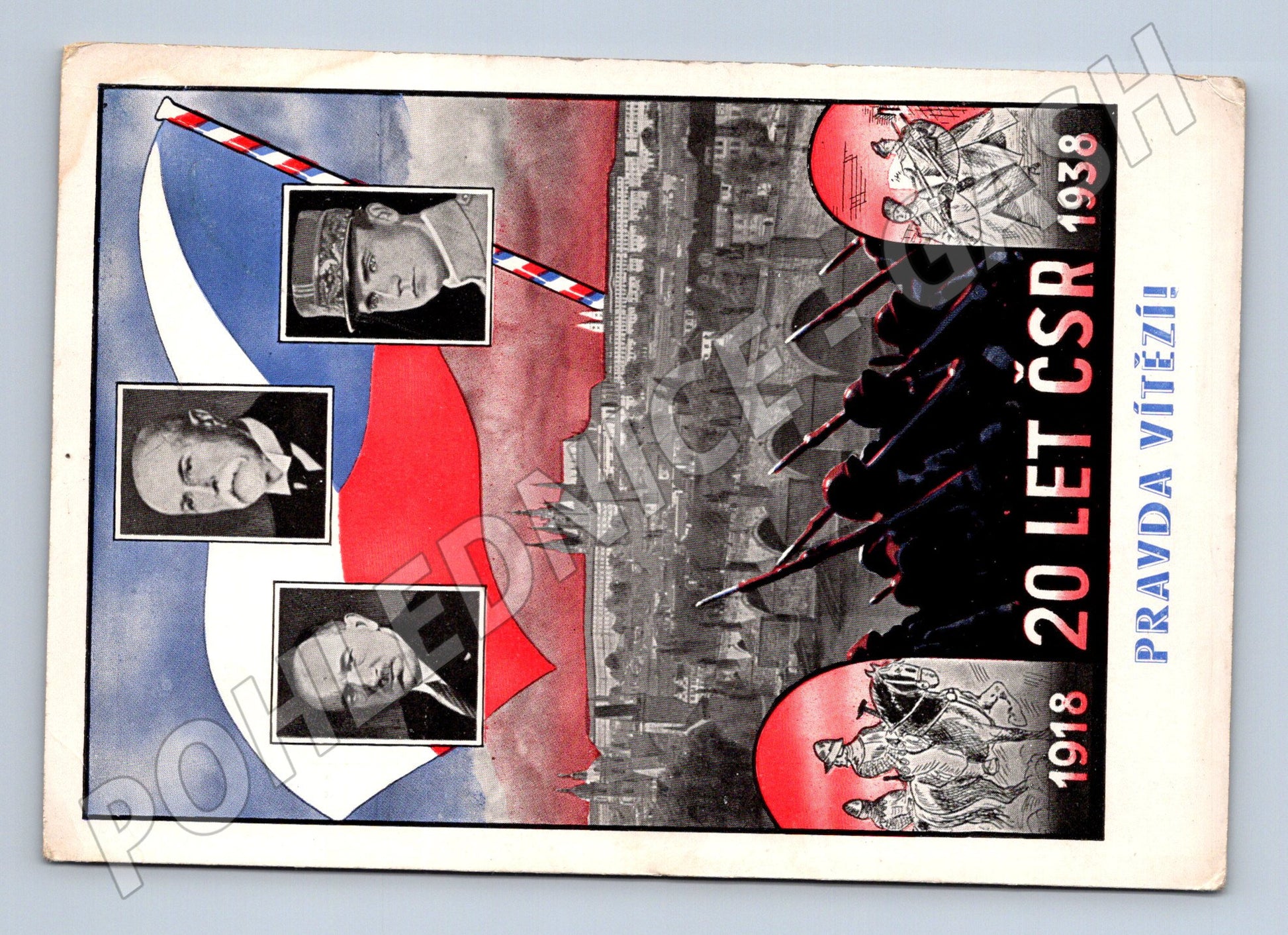 Historická pohlednice vydaná k 20. výročí vzniku Československé republiky (ČSR), tedy v roce 1938. Na přední straně je koláž tvořená portréty významných osobností (zejména zakladatelé ČSR) a československou vlajkou, na pozadí panorama Pražského hradu. Pohlednice je doplněna dobovými motivy, obrazy legionářů a nápisy „1918 – 20 let ČSR – 1938“, „Pravda vítězí!“. Zadní strana je čistá, určena pro napsání adresy a vzkazu. Pohlednice je ve velmi dobrém sběratelském stavu, zajímavý dobový dokument vhodný pro sběratele historických pohlednic a zájemce o období první republiky.