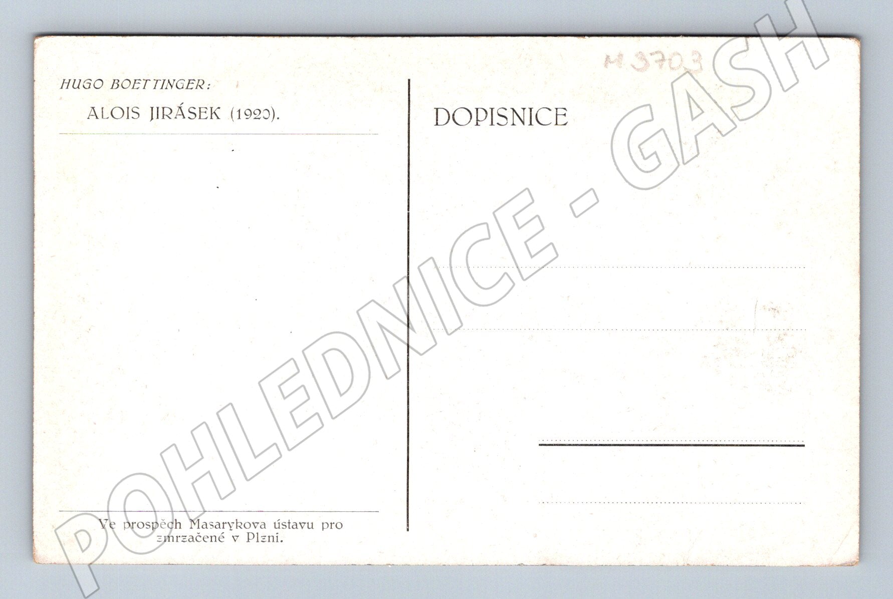 Starší pohlednice s kresbou Aloise Jiráska od umělce Hugo Boettingera z roku 1920. Na přední straně je kvalitní portrét známého českého spisovatele. Zadní strana je neprošlá, vepsáno: Ve prospěch Masarykova ústavu pro zmrzačené v Plzni. Zajímavý sběratelský kousek s charitativním zaměřením, vhodné pro milovníky literatury či sběratele pohlednic s vyobrazením historických osobností.