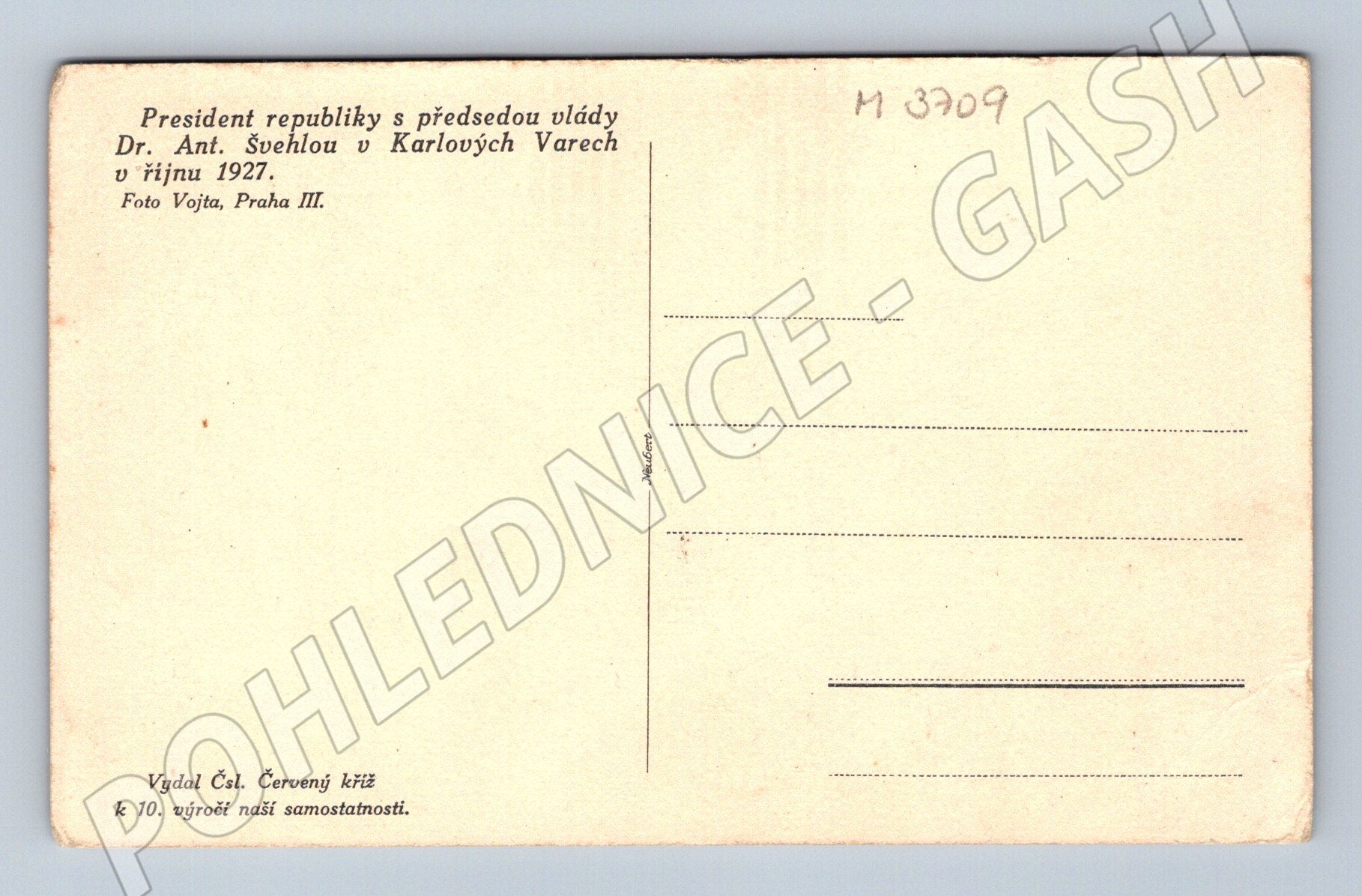 Originální historická pohlednice vydaná k 10. výročí samostatnosti Československa, zachycující prezidenta republiky s předsedou vlády Dr. Antonínem Švehlou při návštěvě Karlových Varů v říjnu 1927. Fotografii pořídil známý fotograf Vojta z Prahy. Pohlednice byla vydána Československým červeným křížem a na zadní straně je popis v češtině. Vhodné pro sběratele pohlednic s tematikou první republiky, významných osobností a historických událostí. Jedná se o malý formát do roku 1950, nezaslaný, v pěkném původním stavu. Skvělý sběratelský kousek.
