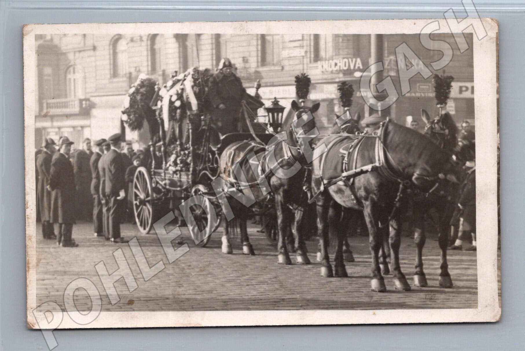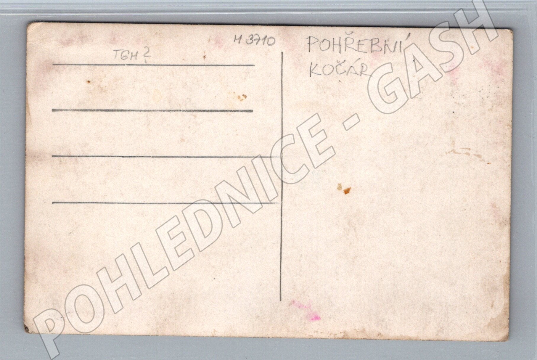 Starý černobílý pohled z konce 1. poloviny 20. století zachycující pohřební průvod s koňským pohřebním kočárem jedoucím ulicemi města. Na pohlednici je patrná dobová atmosféra, elegantně ustrojení lidé i zdobený vůz tažený několika koňmi. Na zadní straně je ručně psaný nápis „POHŘEBNÍ KOČÁR“. Pohlednice nese známky stáří – lehké zašpinění, drobné oděrky v rozích. Typický sběratelský kus pro zájemce o historickou dopravu, staré tradice či městskou historii.