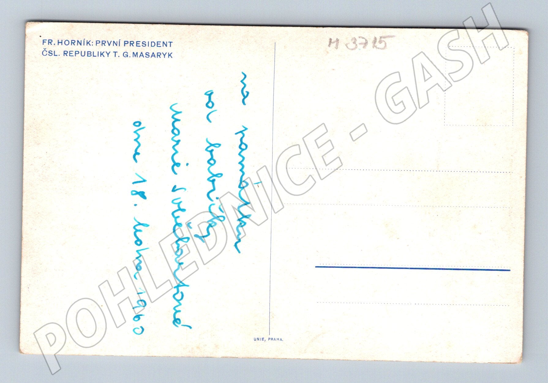 V nabídce je stará pohlednice zobrazující jezdce na koni v podzimní krajině, v popředí pod stromy s padajícím listím. Na zadní straně pohlednice je ručně psaný vzkaz datovaný 18. března 1960. V horní části adresové strany je vytištěno: FR. HORNÍK: PRVNÍ PRESIDENT ČSL. REPUBLIKY T. G. MASARYK . Vydavatel: Unie, Praha. Pohlednice je ve velmi dobrém stavu, vhodná pro sběratele tematických pohlednic s koňmi či historických pohlednic z ČR.
