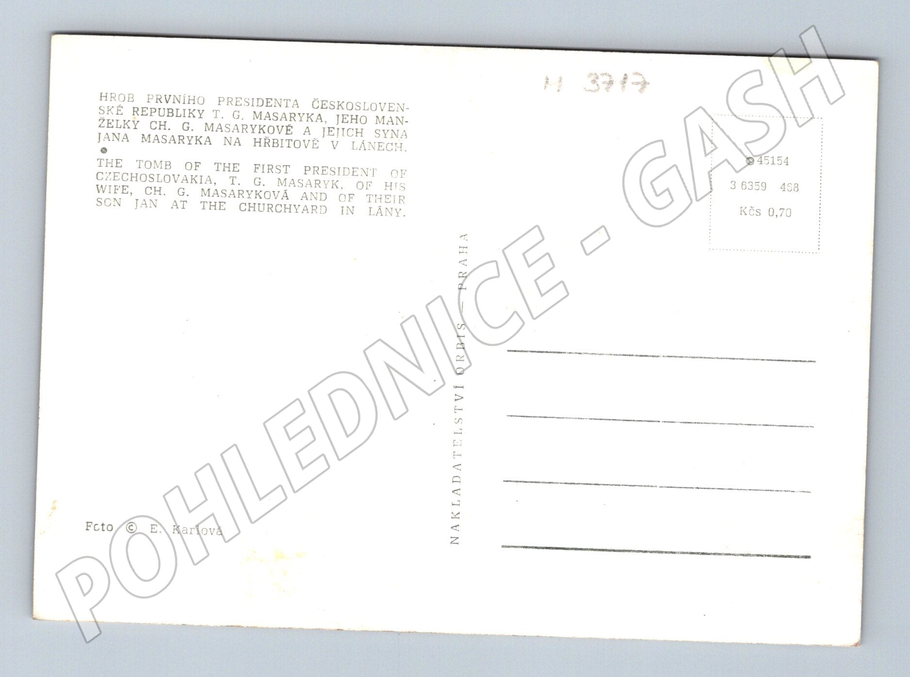 Originální černobílá pohlednice zobrazující hrob prvního prezidenta Československé republiky T. G. Masaryka, jeho manželky Charlotty G. Masarykové a jejich syna Jana Masaryka na hřbitově v Lánech. Pohlednice je doplněna textem v češtině a angličtině, který stručně popisuje historický význam místa. Na snímku je patrný pietní charakter hrobu i okolní krajina. Na zadní straně je informace o vydavateli (Orbis Praha) a místo pro známku a adresu. Vhodné pro sběratele historických a tematických pohlednic.