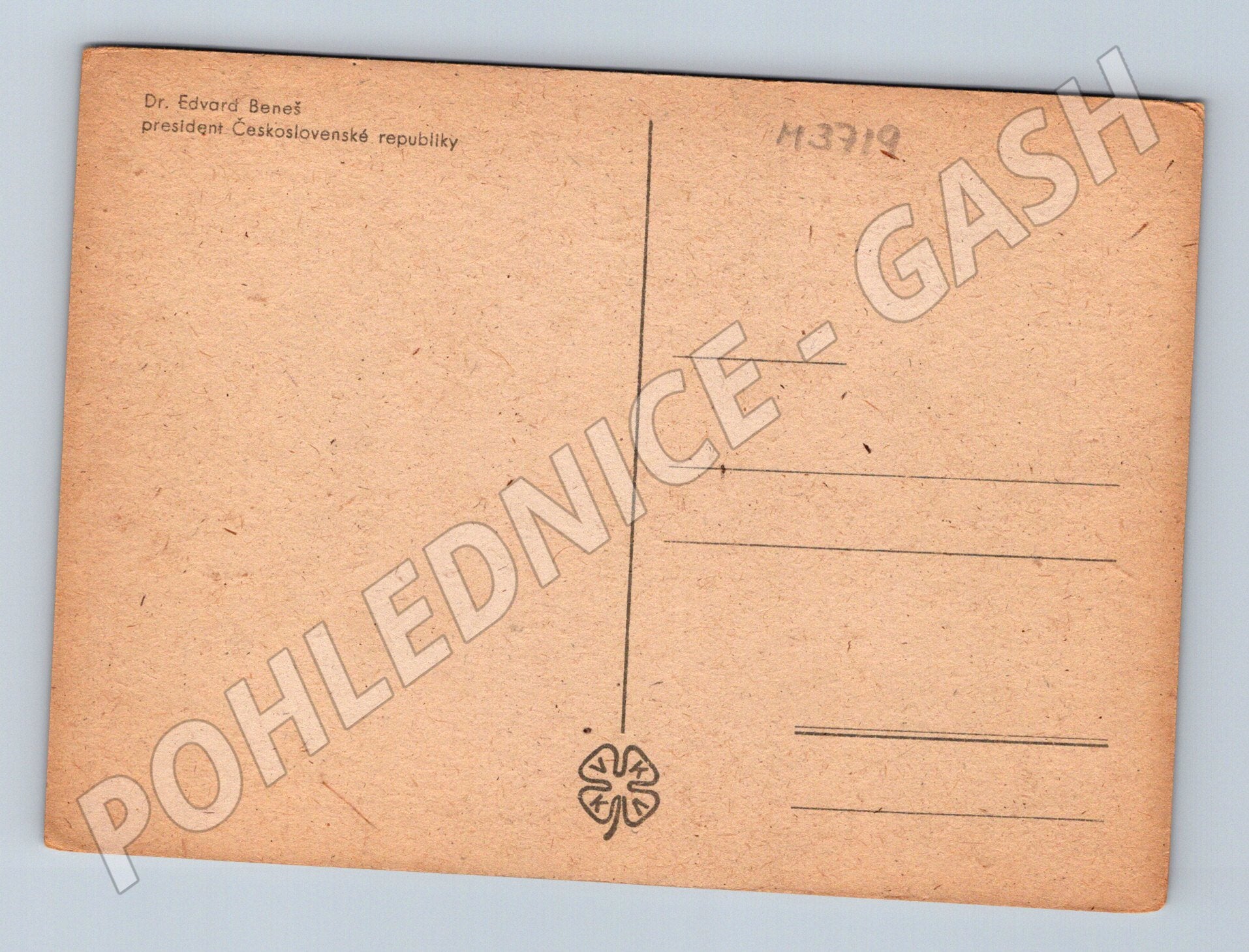 Originální historická pohlednice s portrétem Dr. Edvarda Beneše, prezidenta Československé republiky. Pohlednice je v sepia tónu, na přední straně je statický snímek prezidenta ve formálním oděvu s dokumentem v ruce. Na zadní straně je vytištěno jméno Dr. Edvarda Beneše a uvedení jeho titulu jako prezidenta Československé republiky. Pohlednice má klasický formát pro sběratelské účely, bez známek používání. Skvělý doplněk do sbírky historických pohlednic nebo předměty spojenými s československou historií.