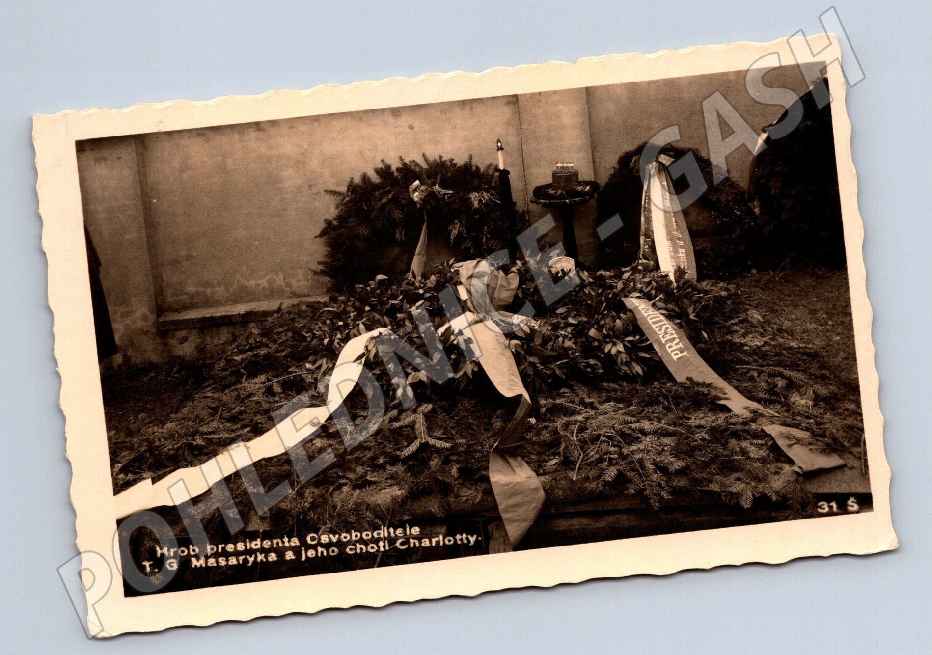 Originální historická pohlednice s motivem hrobu prezidenta Osvoboditele T. G. Masaryka a jeho choti Charlotty na hřbitově v Lánech. Černobílá pohlednice s věnci a stuhami, autenticky zachycuje pietní místo. Na zadní straně viditelné razítko LÁNY HŘBITOV , rukopisná adresa a známka ČSR se smutečním přítiskem, odesláno v roce 1937. Pohlednice je ve velmi dobrém stavu s mírnými známkami stáří na okrajích, bez zásadních defektů. Unikátní sběratelský exemplář z období první republiky, vhodné pro milovníky české historie a sběratele pohlednic.