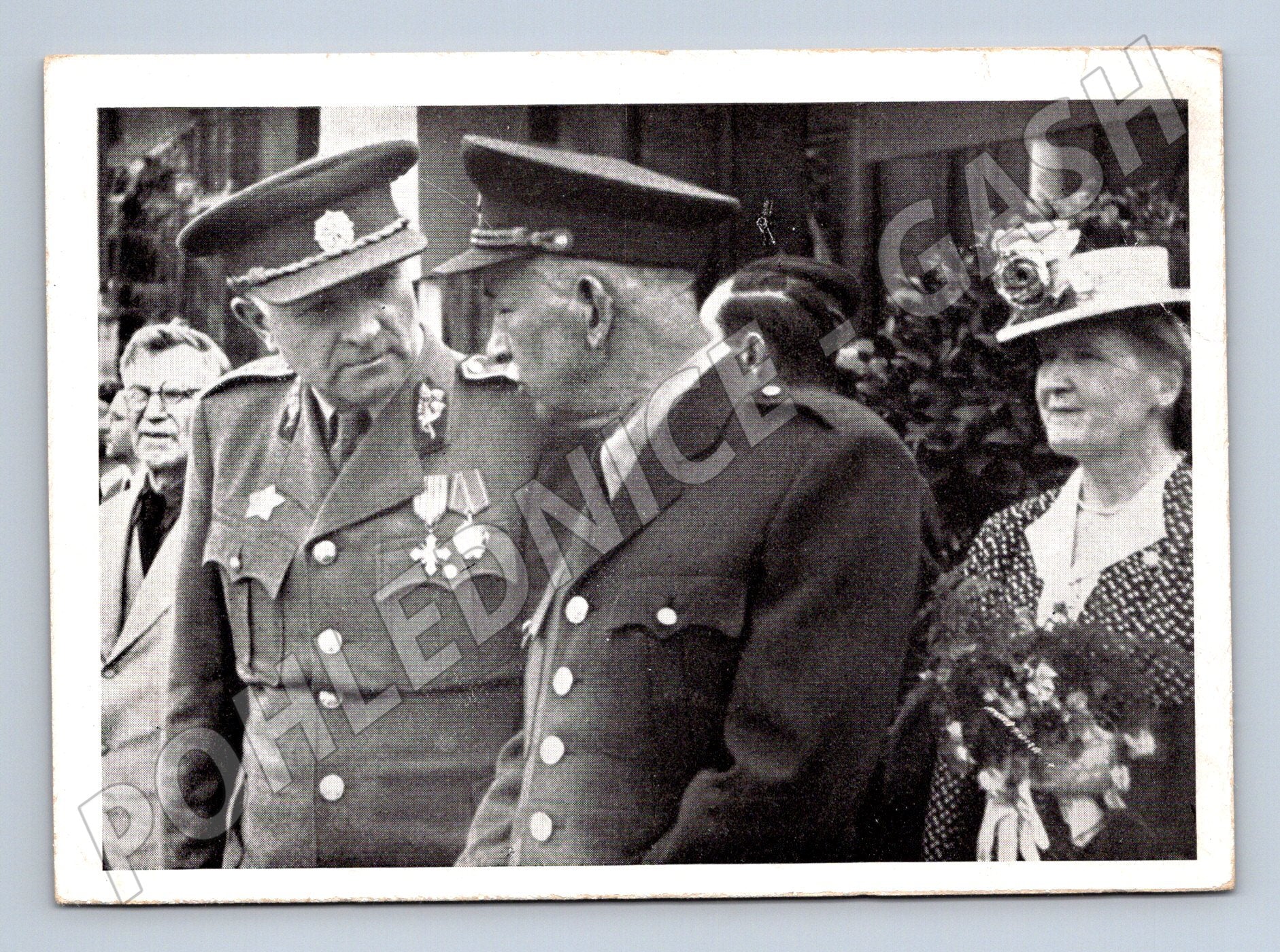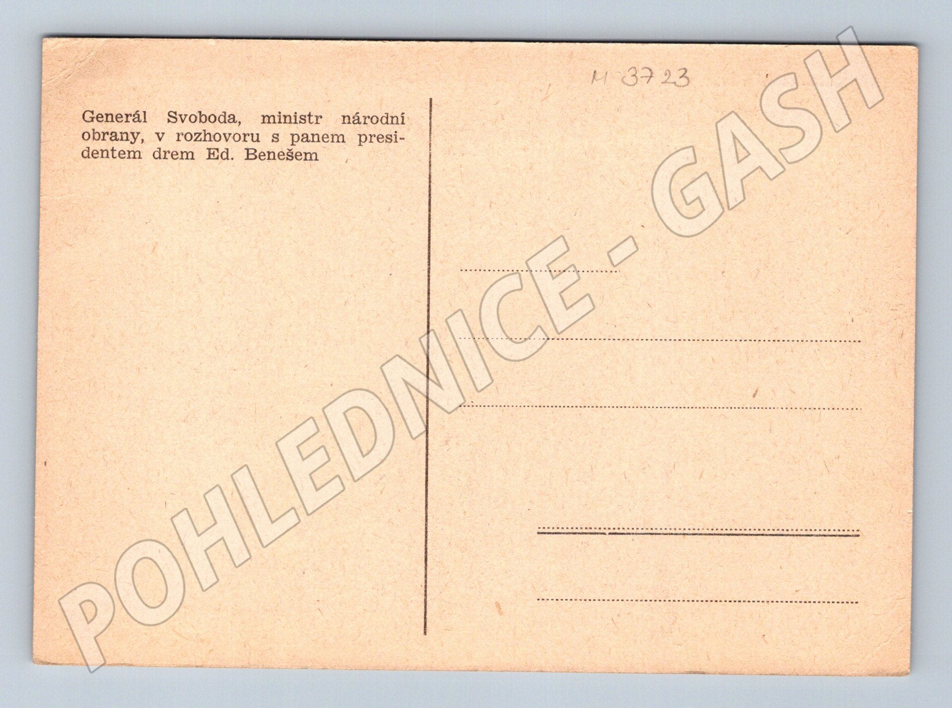 Nabízím starou černobílou pohlednici, na které je zachycena významná historická událost - rozhovor generála Ludvíka Svobody, tehdejšího ministra národní obrany, s prezidentem Edvardem Benešem. Pohlednice pochází z období kolem poloviny 20. století a na zadní straně je popis: Generál Svoboda, ministr národní obrany, v rozhovoru s panem presidentem drem Ed. Benešem . Pohlednice je v pěkném sběratelském stavu bez popsané zadní strany. Výborný sběratelský kousek pro zájemce o českou historii, politiku či pohlednice s historickými osobnostmi.