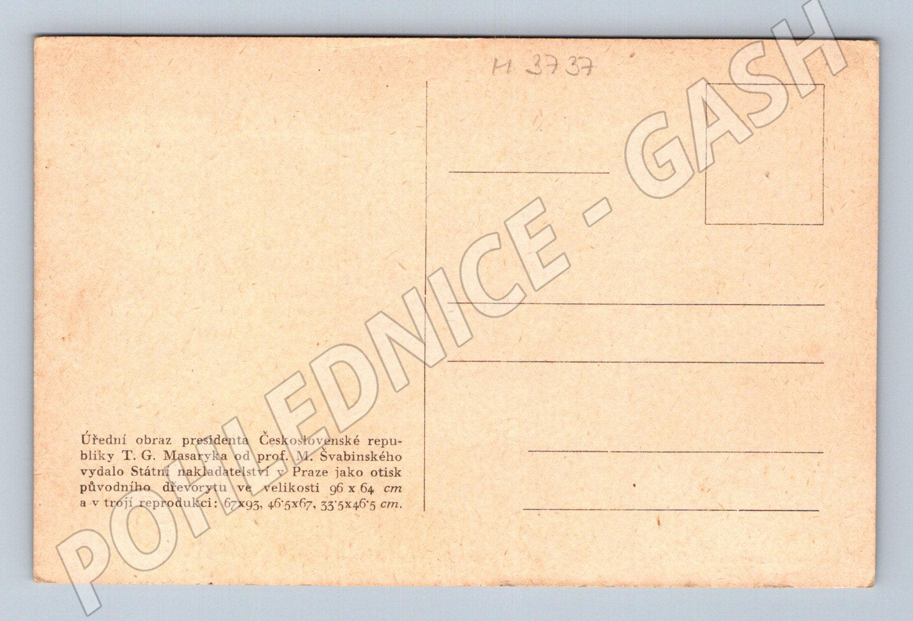 Nabízím sběratelskou pohlednici s oficiálním portrétem prvního prezidenta Československé republiky T. G. Masaryka. Jedná se o uměleckou reprodukci dřevorytu od prof. M. Švabinského, který vydalo Státní nakladatelství v Praze. Pohlednice nese popis rozměrů původního díla i trojí reprodukce. Zadní strana je čistá, nepopsaná, pouze s vydavatelským popisem. Skvělý sběratelský kousek dokumentující významnou osobnost a historii první Československé republiky. Stav velmi dobrý, odpovídá stáří pohlednice.