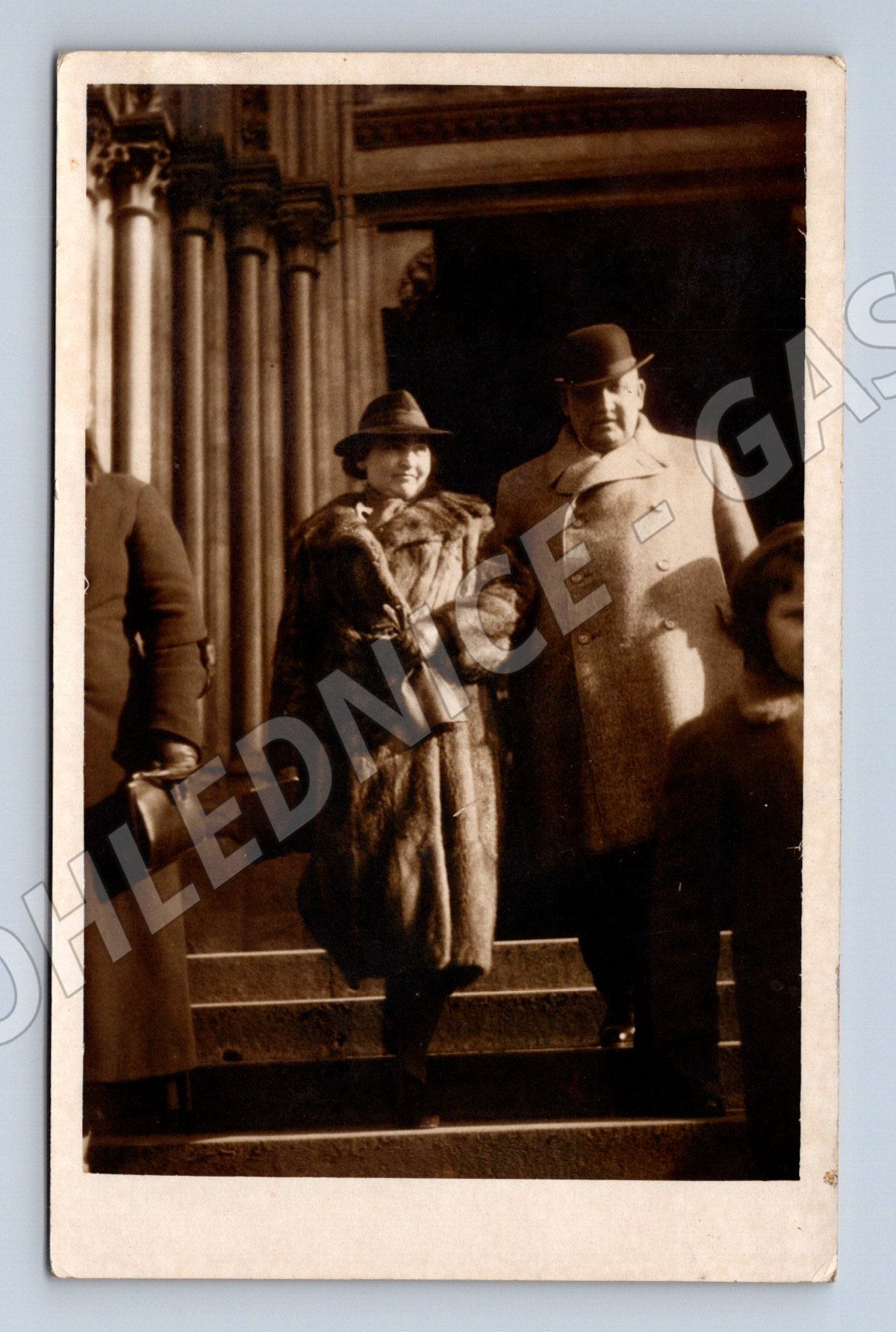 Historická černobílá pohlednice zachycující elegantně oblečené osobnosti před monumentálními sloupy (pravděpodobně před významnou budovou nebo institucí). Na rubové straně je ručně psaný vzkaz s čitelným jménem, razítko s datem a fragment poštovní známky/razítka. Stav pohlednice odpovídá stáří – drobné opotřebení, místy skvrny a stopy lepení. Ideální pro sběratele historických pohlednic či milovníky období první poloviny 20. století.