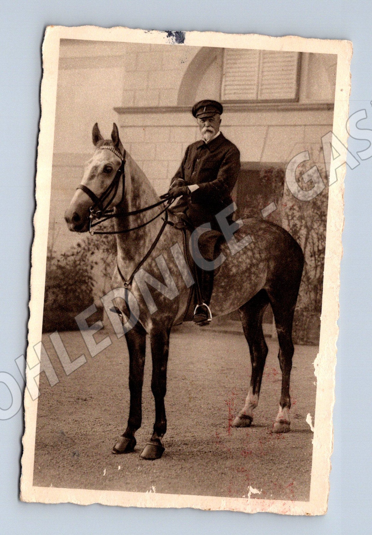 Originální černobílá pohlednice z roku 1935 s motivem jezdce na koni. Na pohlednici je pravděpodobně historická osobnost, která je vyobrazena před budovou. Pohlednice byla odeslána z Prahy, což dokládá razítko a originální známky včetně motivu T. G. Masaryka a znaku Československa. Zadní strana je popsána a opatřena sběratelskými razítky. Pohlednice nese znaky stáří - mírné opotřebení hran a rohy. Vhodné pro sběratele pohlednic, milovníky koní i zájemce o československou historii.