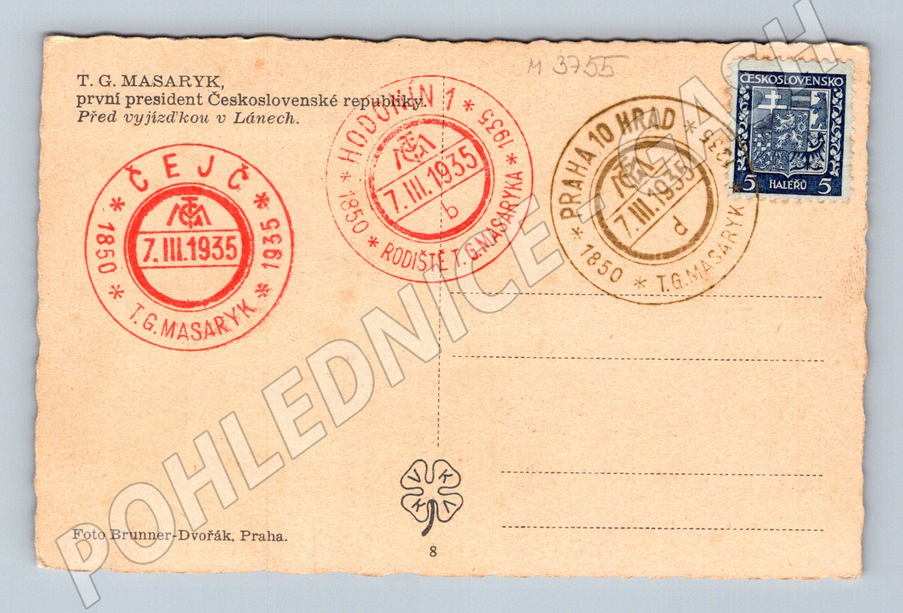 Vzácná černobílá pohlednice s portrétem prvního prezidenta Československé republiky T. G. Masaryka na koni, pořízená během jeho projížďky v Lánech. Pohlednice je datována 7. 3. 1935, obsahuje originální frankovací známku a několik razítek (mj. Čejč, Praha 10 Hrad, Hodonín – rodiště T. G. Masaryka). Na zadní straně označení a popis, že snímek pořídil Brunner-Dvořák, Praha. Skvělá položka pro sběratele historických pohlednic a milovníky osobnosti T. G. Masaryka. Stav viz foto.