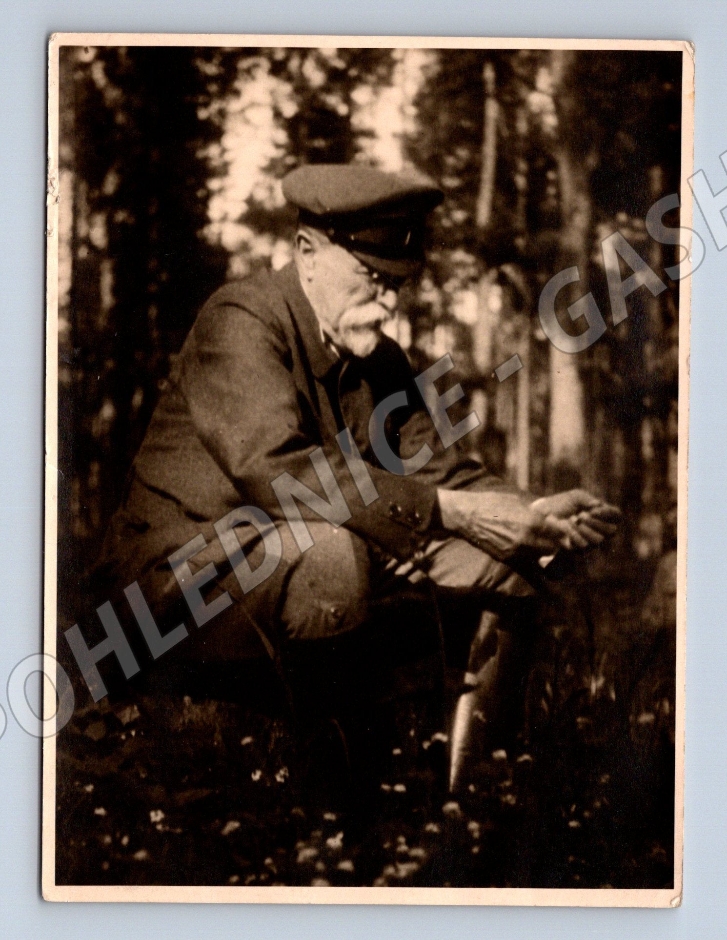 Nabízím originální historickou pohlednici s portrétem staršího muže v uniformě, zachyceného během chvíle odpočinku v přírodě. Pohlednice je černobílá, nevšední, s výraznou atmosférou doby. Zadní strana je čistá, bez jakéhokoliv textu, pouze s drobným značením v rohu. Velmi dobrý stav, mírné opotřebení odpovídající stáří. Skvělý kousek do sbírky pohlednic s osobnostmi nebo historickou tematikou.