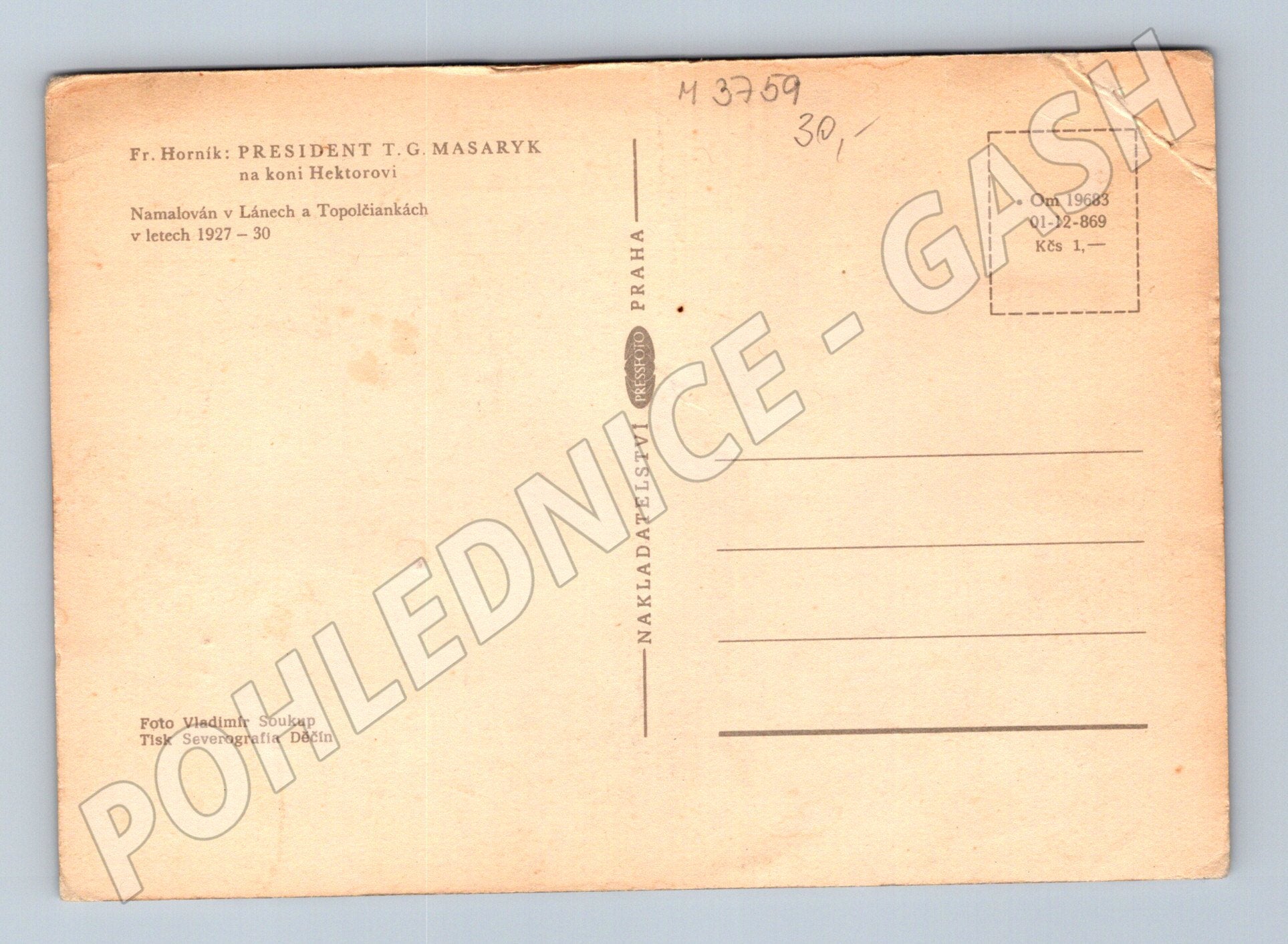 Originální pohlednice s vyobrazením prezidenta T. G. Masaryka na koni Hektorovi podle obrazu Fr. Horníka, malovaného v Lánech a Topoľčiankách v letech 1927–1930. Pohlednice byla vydána nakladatelstvím v Praze, tisk Severografia Děčín, fotografie Vladimír Soukup. Na přední straně pohlednice je tištěný podpis T. G. Masaryka. Pohlednice je ve vintage stavu, má mírně opotřebované okraje a rohy, nese lehké známky stáří (viz foto). Výjimečný sběratelský kousek s historickou hodnotou pro milovníky české historie či sběratele pohlednic s tematikou významných osobností a panovníků. Formát klasického pohlednicového rozměru, zezadu s prostorem pro adresu a známku.