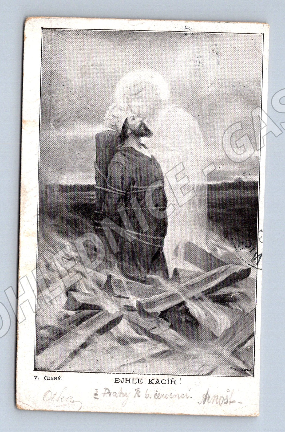 Starobylá černobílá pohlednice s názvem Ejhle kacíř , vydaná nakladatelem Grosman a Svoboda v Praze. Na přední straně je umělecký motiv, který pravděpodobně ztvárňuje historickou či náboženskou scénu s postavou svázaného muže na hranici, za nímž stojí světlá postava (možná světec či anděl). Pohlednice je ručně popsána a byla zaslána v roce 1904, což dokládá dobové razítko a známka na zadní straně. Jedná se o originál, vhodný pro sběratele historických pohlednic ČR. Celkový stav odpovídá stáří, drobné stopy používání, viz foto.