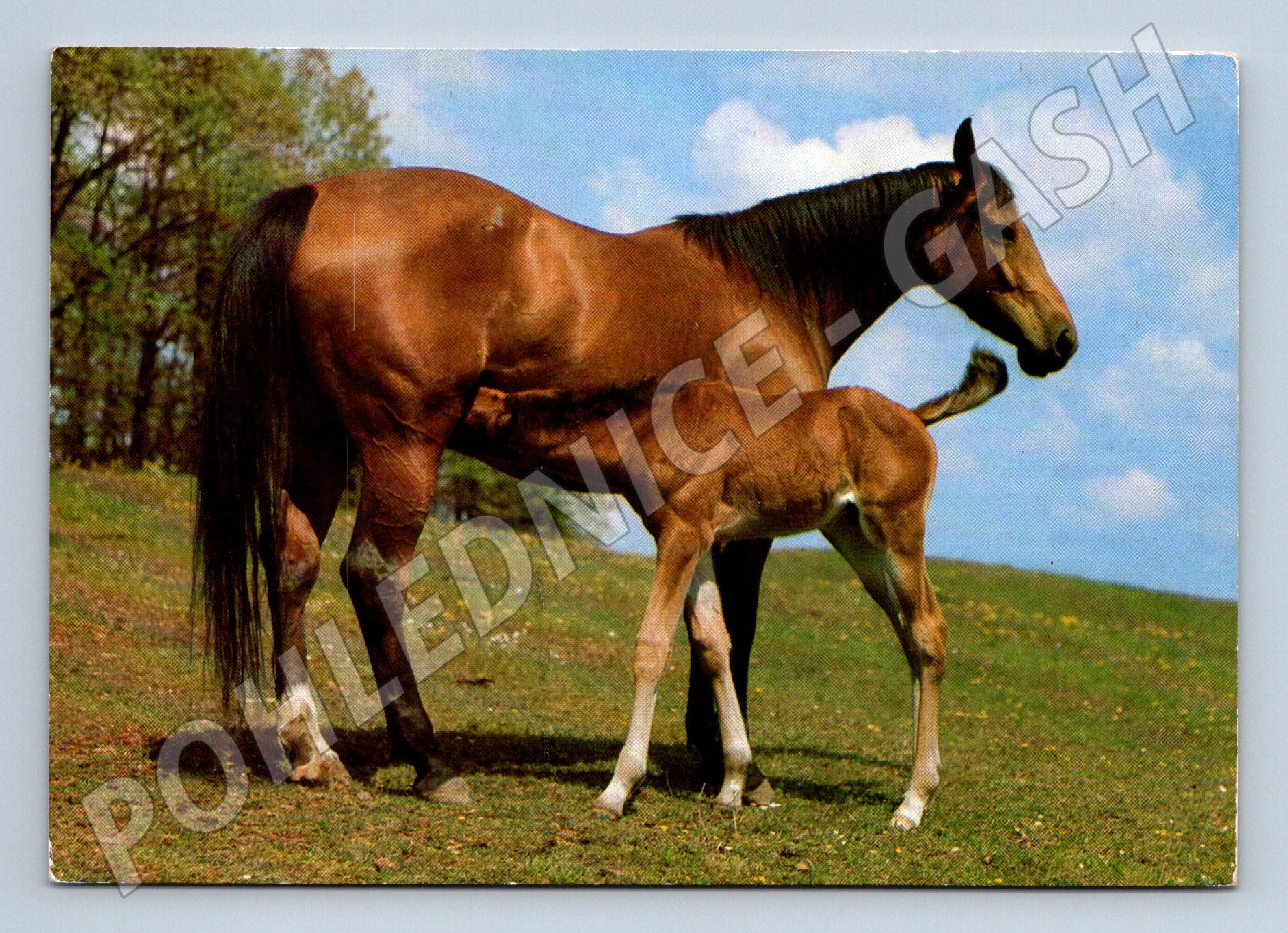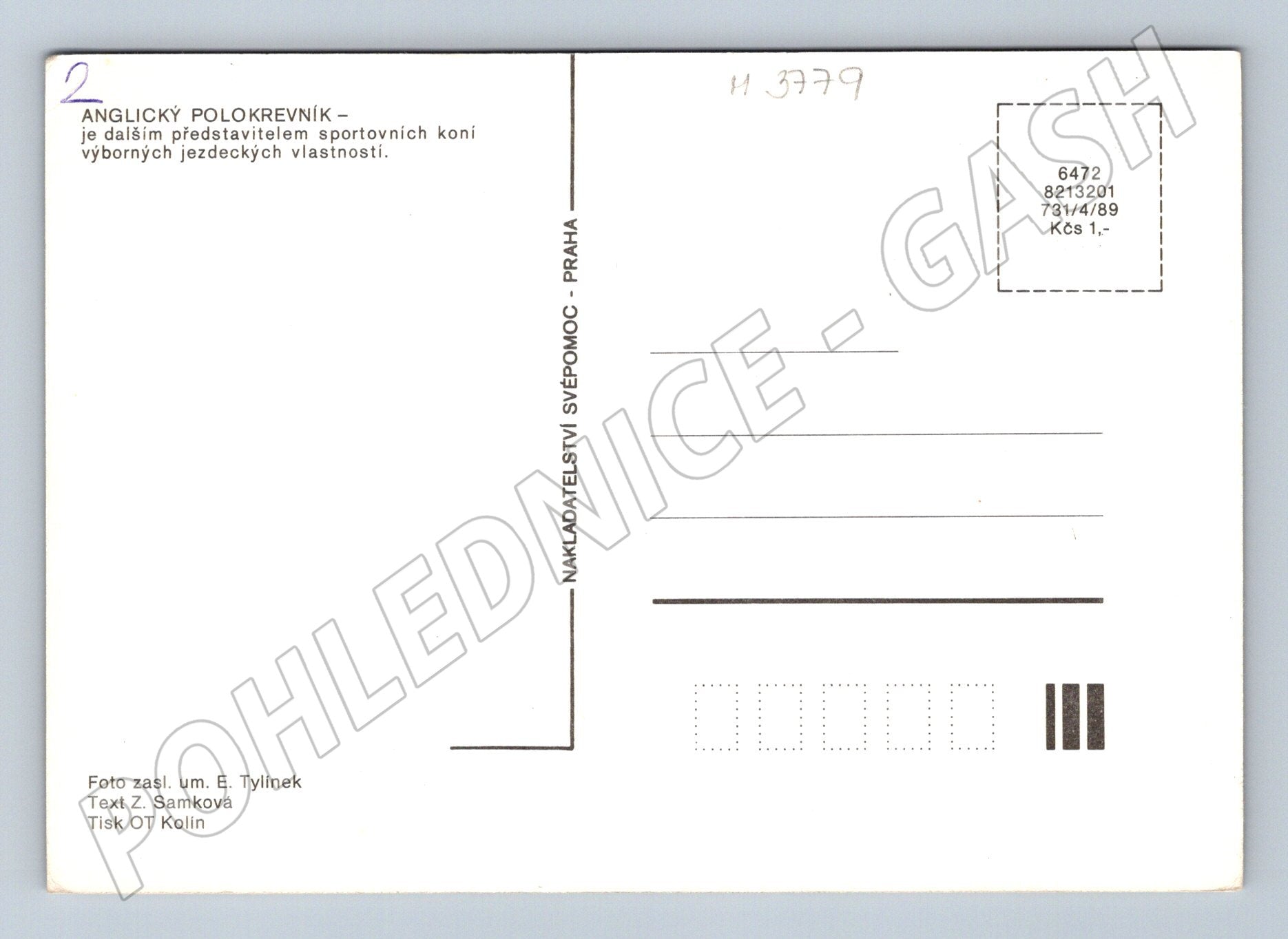Pohlednice s motivem anglického polokrevníka a hříběte na pastvině. Jedná se o sportovní plemeno koní, které je známo svými vynikajícími jezdeckými vlastnostmi. Na přední straně pohlednice je barevná fotografie klisny a jejího mláděte na louce pod modrou oblohou, na zadní straně základní popis plemene. Vydáno nakladatelstvím Svépomoc Praha, foto E. Tylinek, text Z. Samková, tisk OT Kolín. Stav velmi dobrý, nepopsaná, bez známky.