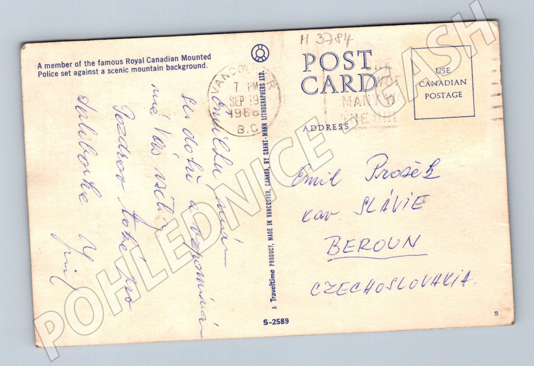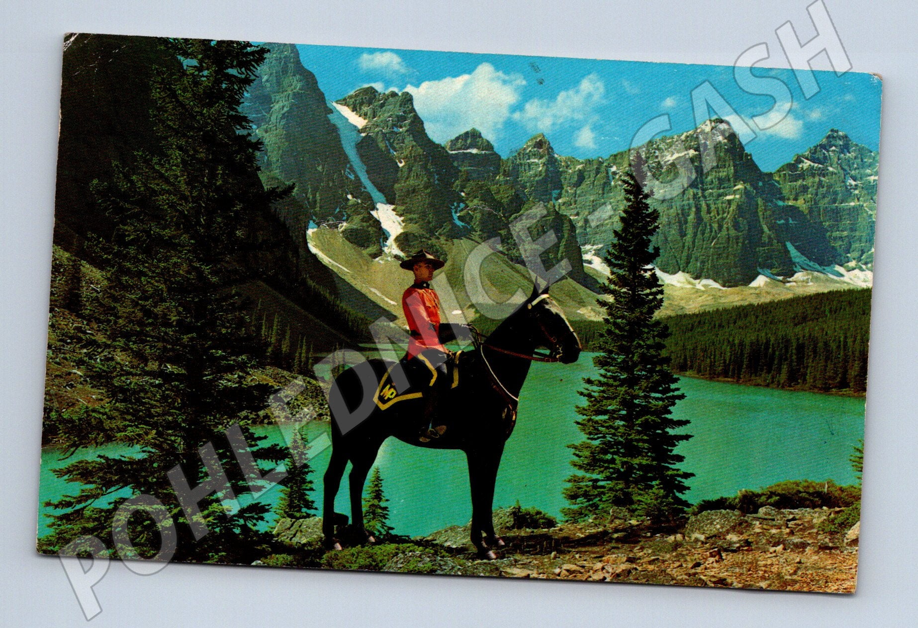 Pohlednice z Kanady zachycující příslušníka slavné Kanadské královské jízdní policie (Royal Canadian Mounted Police) na koni s ikonickou horskou scenérií v pozadí. Vydáno firmou TravelTime, pohlednice byla zaslána z Vancouveru v roce 1966 do Československa. Pohlednice je barevná, na rubu jsou známky používání - ručně psaný pozdrav a adresa příjemce. Velmi atraktivní motiv z oblasti Severní Ameriky, sběratelský a dekorativní předmět.