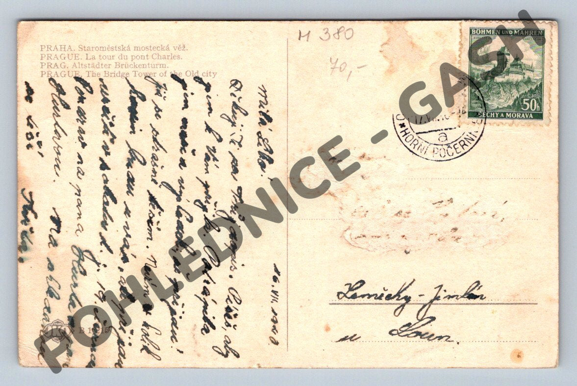 Originální stará pohlednice zobrazující Staroměstskou mosteckou věž v Praze, významnou historickou památku na Karlově mostě. Pohlednice zachycuje detailní pohled na věž i část okolí, s rušným děním na mostě. Na zadní straně je ručně psaný text a známka s razítkem z období Protektorátu Čechy a Morava (Böhmen und Mähren), což upozorňuje na její historickou hodnotu. Pohlednice nese stopy stáří a používání, drobné flíčky a opotřebení hran. Sbírkový kousek pro milovníky historických pohlednic a Prahy.