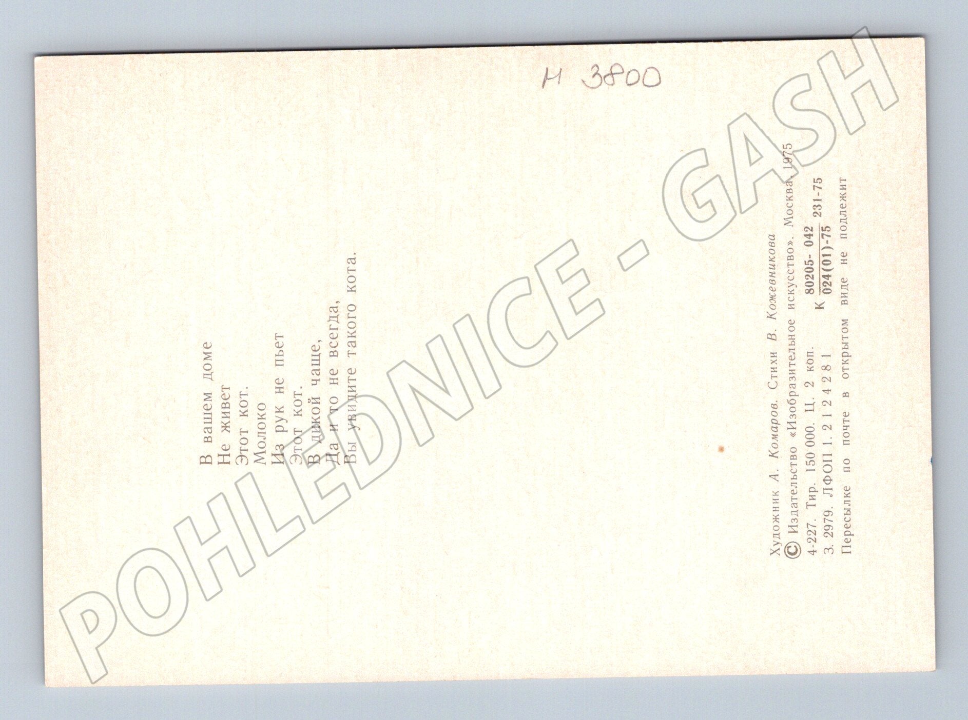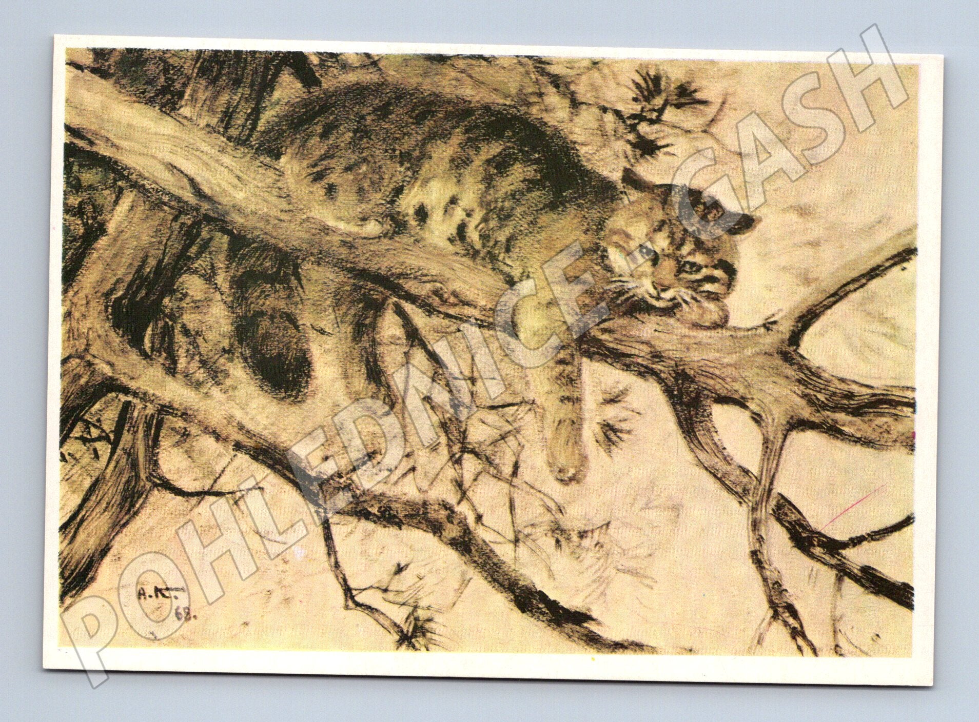 Originální sovětská pohlednice vydaná v roce 1975 s ilustrací divoké kočky na větvi od umělce A. Komarova. Pohlednice je ozdobená i krátkou básní v ruštině od V. Koževnikova. Není použita, velmi pěkný sběratelský stav. Rozměr klasický, tisk černobílý/sépiový, na zadní straně vydavatelské údaje. Krásný motiv kočky v přírodním prostředí vhodný do sbírky motivů zvířat či ruských pohlednic.