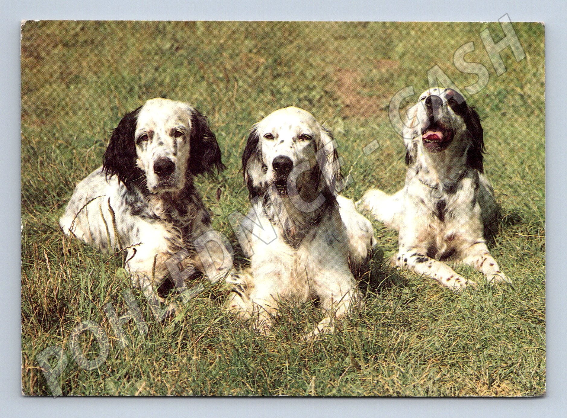 Originální pohlednice z dob Československa s motivem tří anglických setrů, kteří odpočívají na trávníku. Pohlednice byla zaslána a je orazítkovaná s originální známkou z roku 1989 (výročí lidových krojů). Na zadní straně naleznete ručně psaný vzkaz adresovaný dětské léčebně ve Františkových Lázních. Fotografie na přední straně pochází od fotografa E. Studničky a byla vydána v edici Panorama. Ideální sběratelský kousek pro milovníky psů a dobových pohlednic.