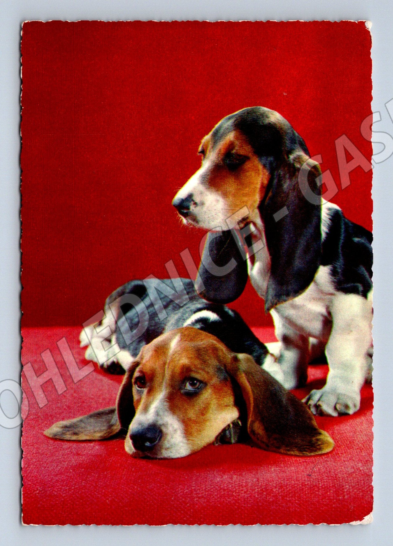 Originální stará pohlednice se dvěma štěňaty bígla na červeném podkladu. Pohlednice je zaslaná poštou, na zadní straně je ručně psaný text a poštovní razítko z roku 1974. Ve spodní části je označení Kodak Ektachrome. Okraje pohlednice jsou decentně vlnkované. Stav odpovídá stáří, drobné známky opotřebení. Skvělý sběratelský kousek pro milovníky psů nebo retro pohlednic.