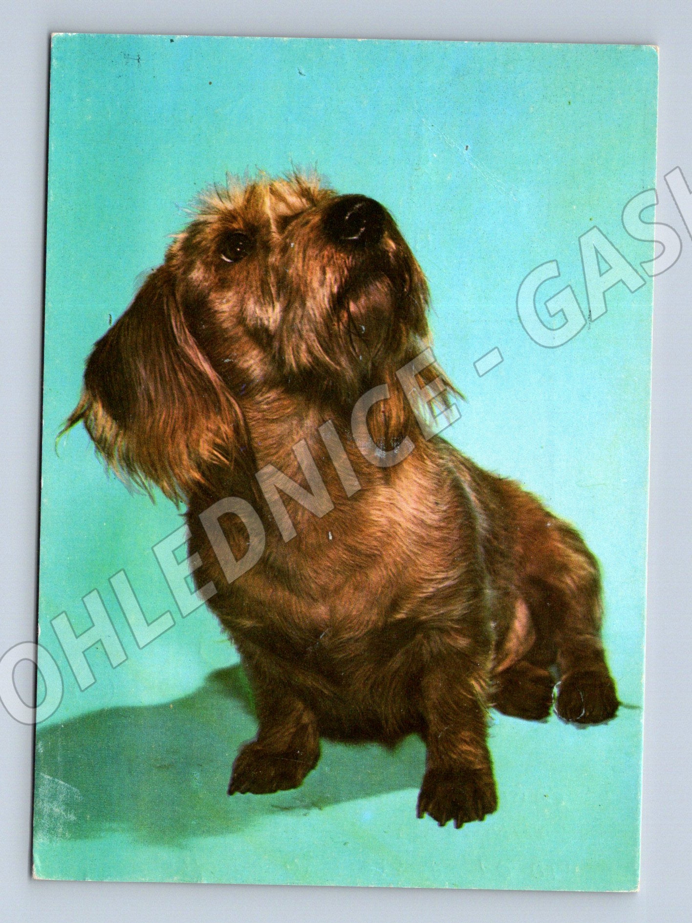 Originální stará pohlednice s motivem drsnosrstého jezevčíka. Na přední straně je krásná barevná fotografie psa na modrém pozadí. Zadní strana obsahuje soutěžní kupon, pěkné ručně psané adresování a známku s razítkem z roku 1979. Pohlednice je určena sběratelům i milovníkům psů. Rozměr klasického pohlednicového formátu, mírné opotřebení odpovídající stáří. Vhodné do sbírky či jako dárek pro pejskaře.