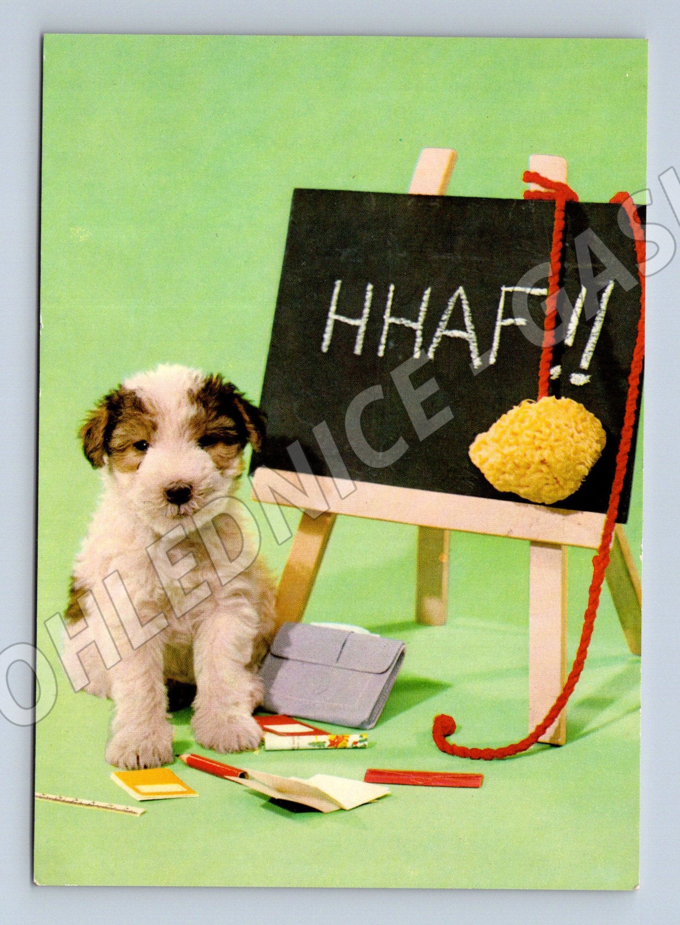 Retro pohlednice štěně u tabule HAF!! , Orbis, 1972