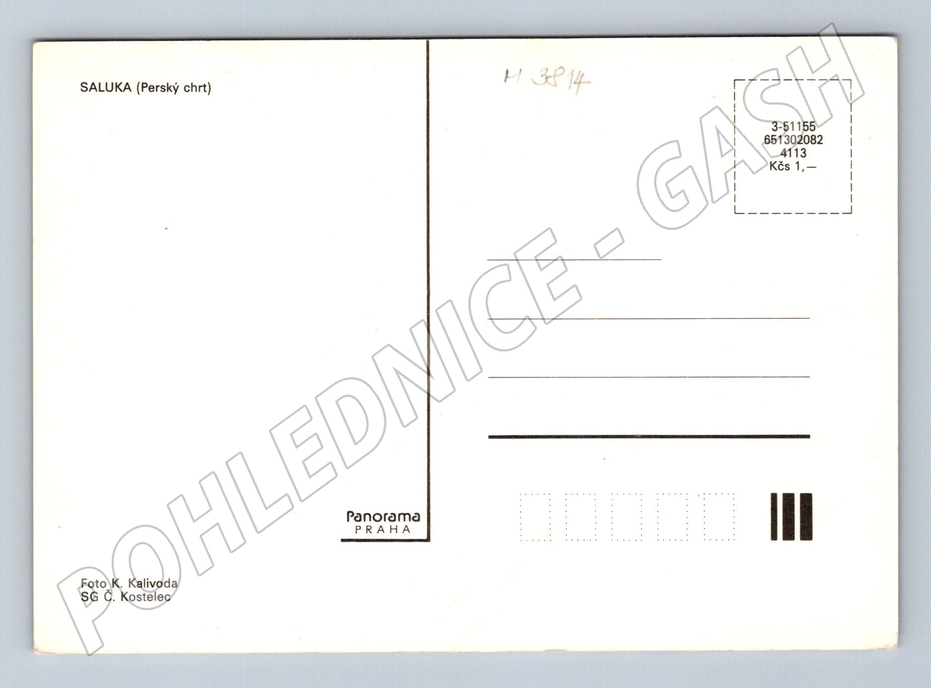 Originální pohlednice s fotografií plemene saluka (perský chrt). Pohlednice je vydána nakladatelstvím Panorama Praha, autorem fotografie je K. Kalivoda. Na přední straně se nachází detailní barevný snímek hlavy saluky na zeleném travnatém pozadí. Zadní strana s běžnými údaji pro zápis adresy a odeslání, vlevo nahoře s popisem SALUKA (Perský chrt) a cenou 1 Kčs. Stav pohlednice je velmi dobrý, bez psaní a známky. Skvělá volba pro sběratele kynologických pohlednic či milovníky psů.