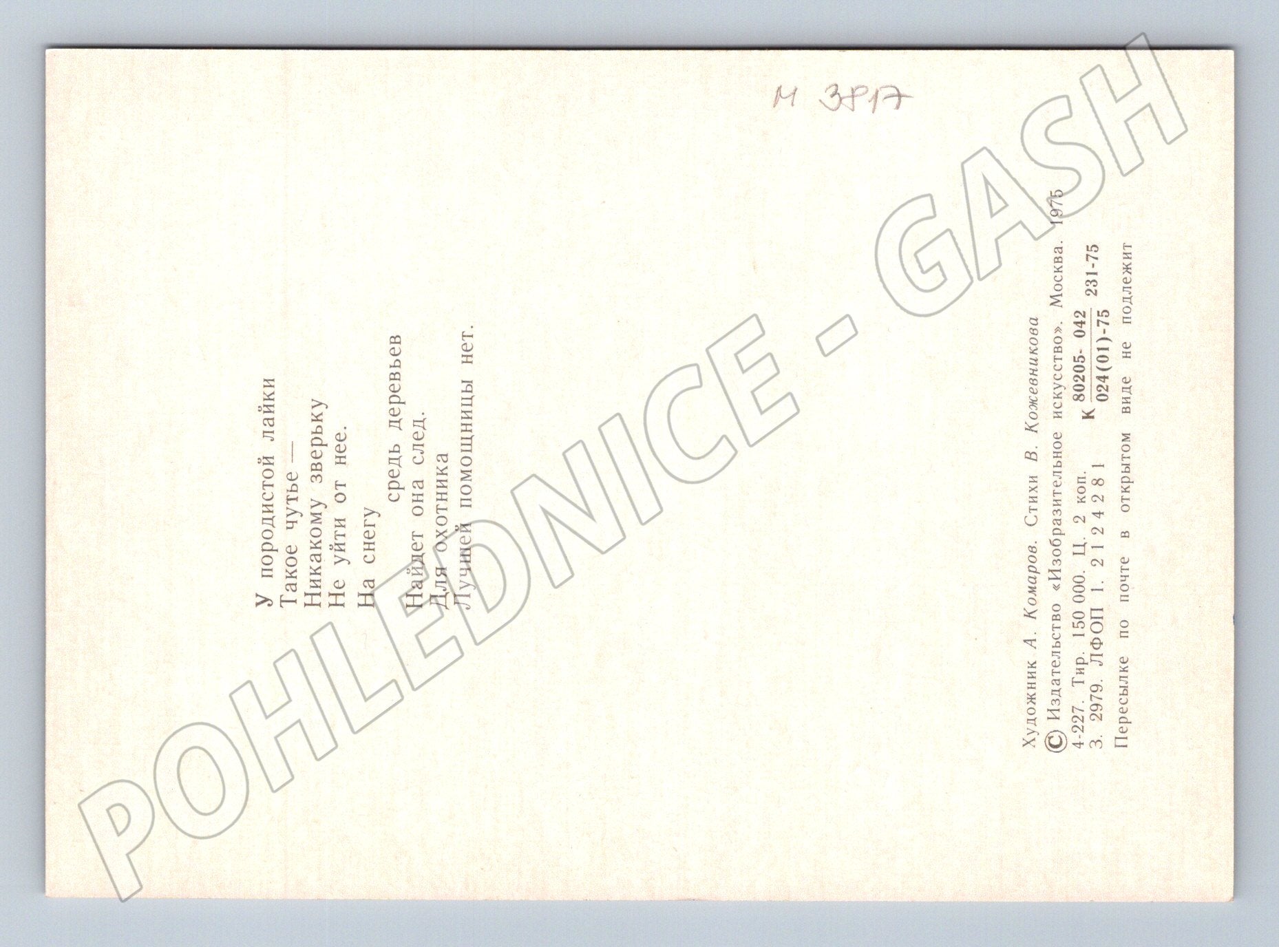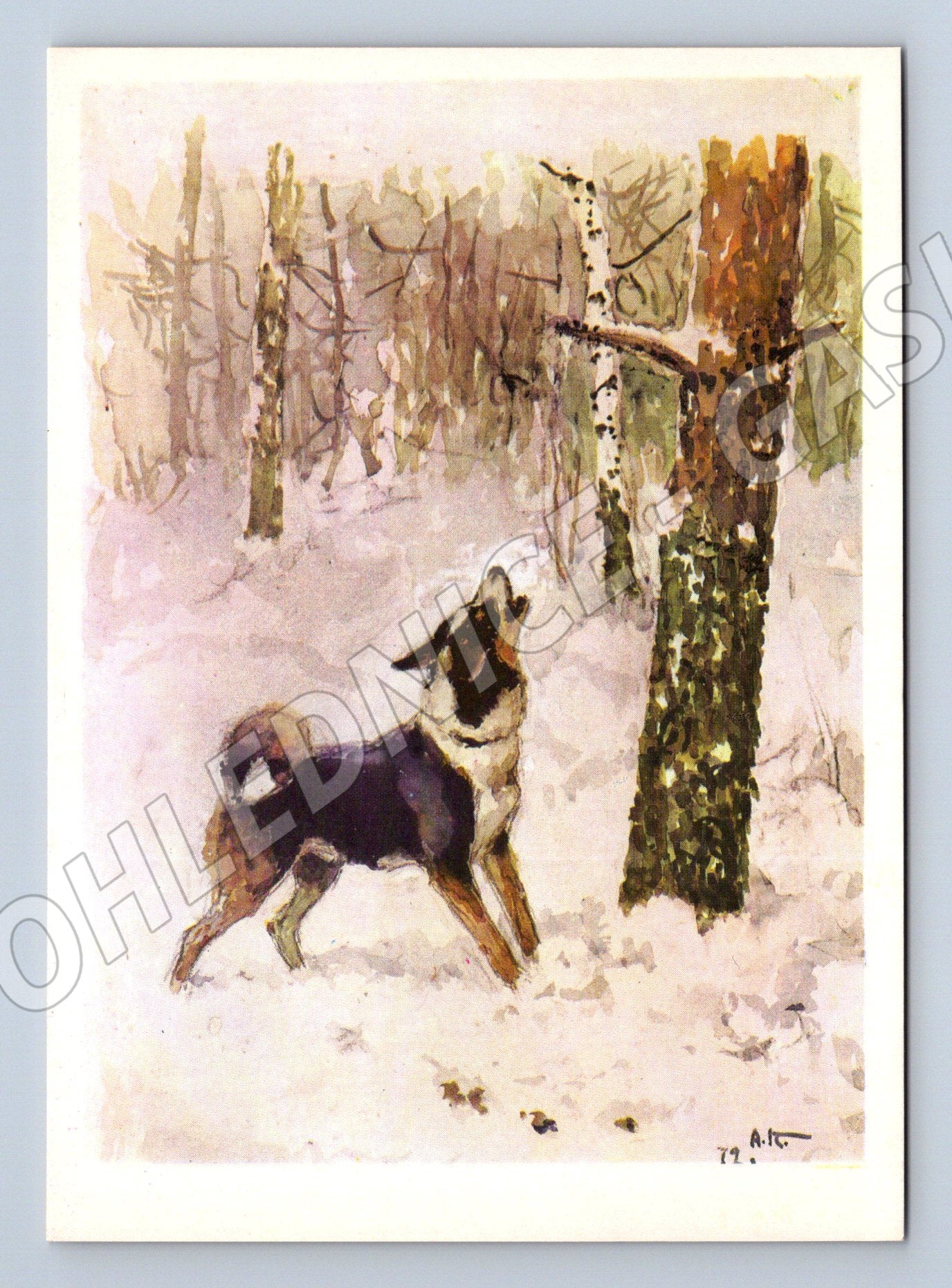 Nabízím starou pohlednici z roku 1975 s motivem psa (laiky) na sněhu. Pohlednice je ilustrovaná A. Komarovem, na zadní straně je báseň v ruštině od V. Kozhevnikova. Vydal moskevský vydavatelský dům Izobrazitělnoye iskusstvo . Pohlednice je ve velmi pěkném stavu, bez psaní a známky. Ideální pro sběratele pohlednic se zvířecí tematikou, zejména psů. Formát odpovídá čtvercovému provedení. Autorský motiv a kvalitní provedení.