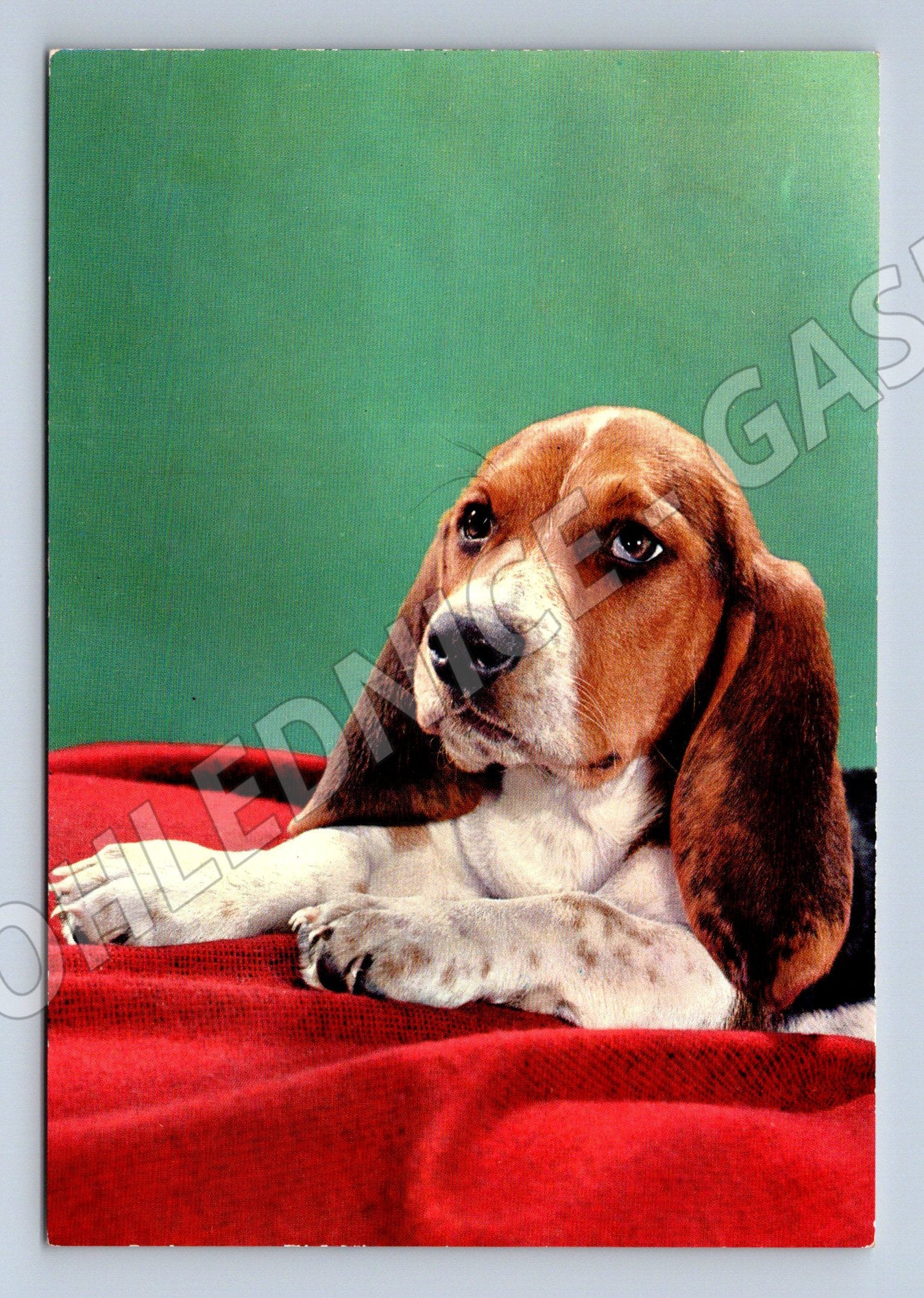 Nabízím originální starou pohlednici se zobrazením psa – bígl ležící na červené dece s pozadím v zelené barvě. Pohlednice byla odeslána, na zadní straně je rukopisný text, razítko a poštovní známka z období Československa. Pohlednice je tištěná v Itálii (Printed in Italy) a má katalogové číslo 310. Skvělý sběratelský kousek pro milovníky psů nebo pohlednic.