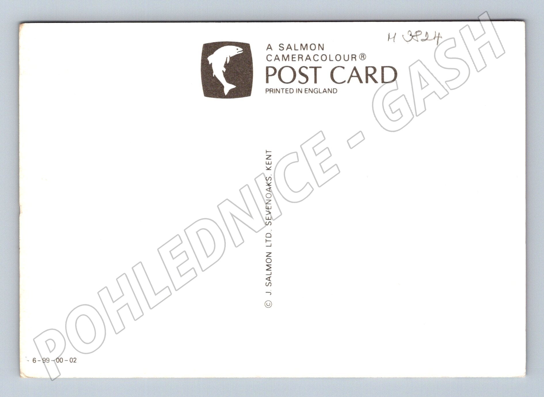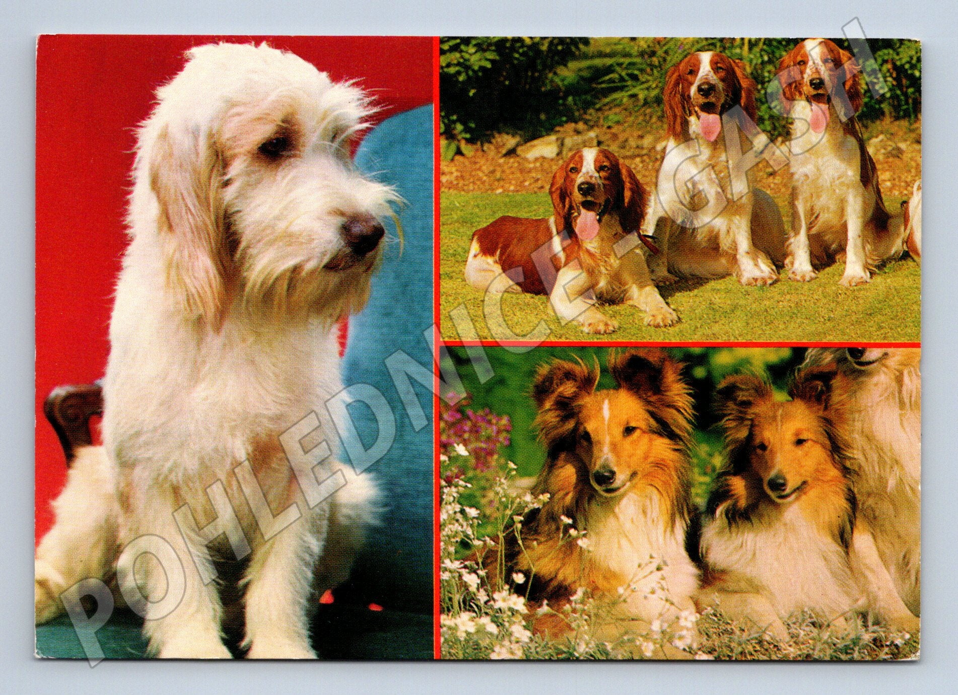 Originální pohlednice s motivem různých psích plemen. Na přední straně jsou zobrazeny barevné fotografie psů – větší portrét světlého psa na červeném pozadí, skupina tří loveckých psů na zahradě a dvojice kolii v přírodě. Pohlednice je neprošlá a ve velmi dobrém stavu. Zadní strana je čistá, vhodná pro vlastní text nebo pro sběratelské účely. Vydavatel J. Salmon Ltd., CameraColour, Velká Británie.
