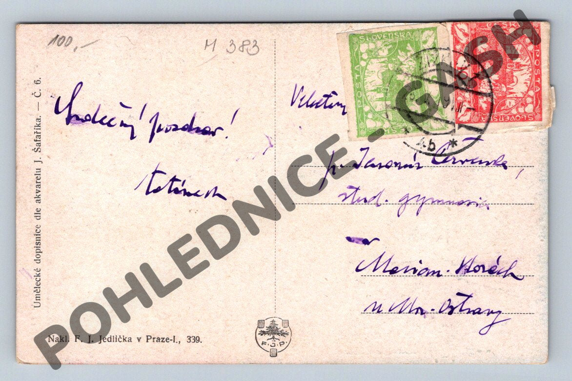 Originální stará pohlednice zobrazující Staroměstskou radnici a Týnský chrám v Praze. Jedná se o uměleckou dopisnici dle akvarelu J. Šafaříka. Pohlednice byla vydána nakladatelstvím F. J. Jedlička v Praze (číslo 339). Na zadní straně je ručně psaný vzkaz a poštovní známky se slovenským motivem. Stav odpovídá stáří – drobné známky používání, razítka a známky z doby první republiky. Atraktivní sběratelský kousek pro milovníky historických pohlednic Prahy a architektury.