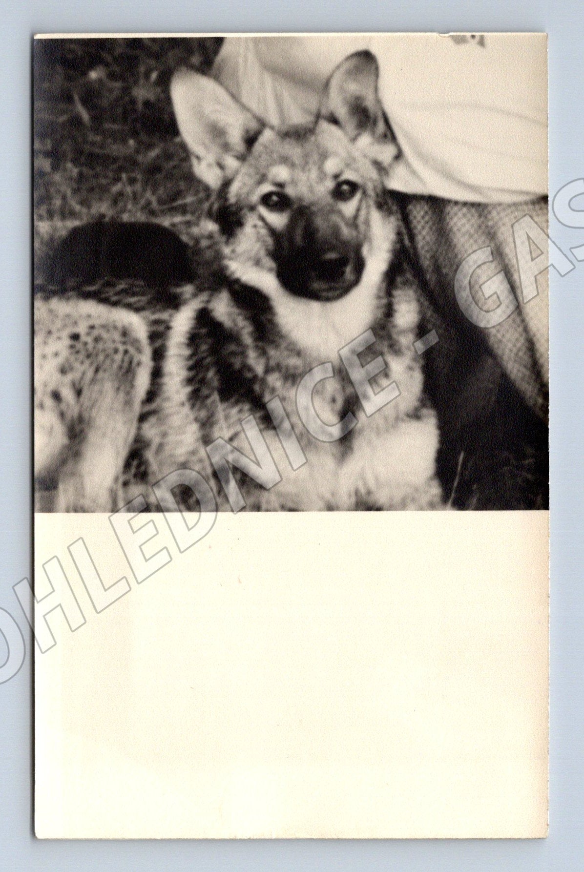 Černobílá pohlednice – mladý pes/vlčák, retro