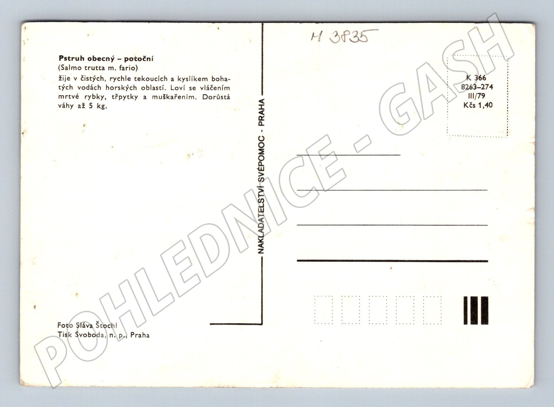 Pohlednice z období Československa s motivem pstruha obecného (Salmo trutta m. fario). Na přední straně je znázorněn typický životní prostředí pstruha v čisté horské řece, fotografie samotného pstruha, ulovení ryby (včetně proutěného košíku) a detail mušek používaných při muškaření. Zadní strana obsahuje základní informace o druhu v češtině. Vydal Svépomoc Praha, foto Sláva Štochl, rok vydání 1979. Sbírkový kus pro milovníky přírody, rybářství a fauny ČR. Dobrý stav, neprošlá poštou.