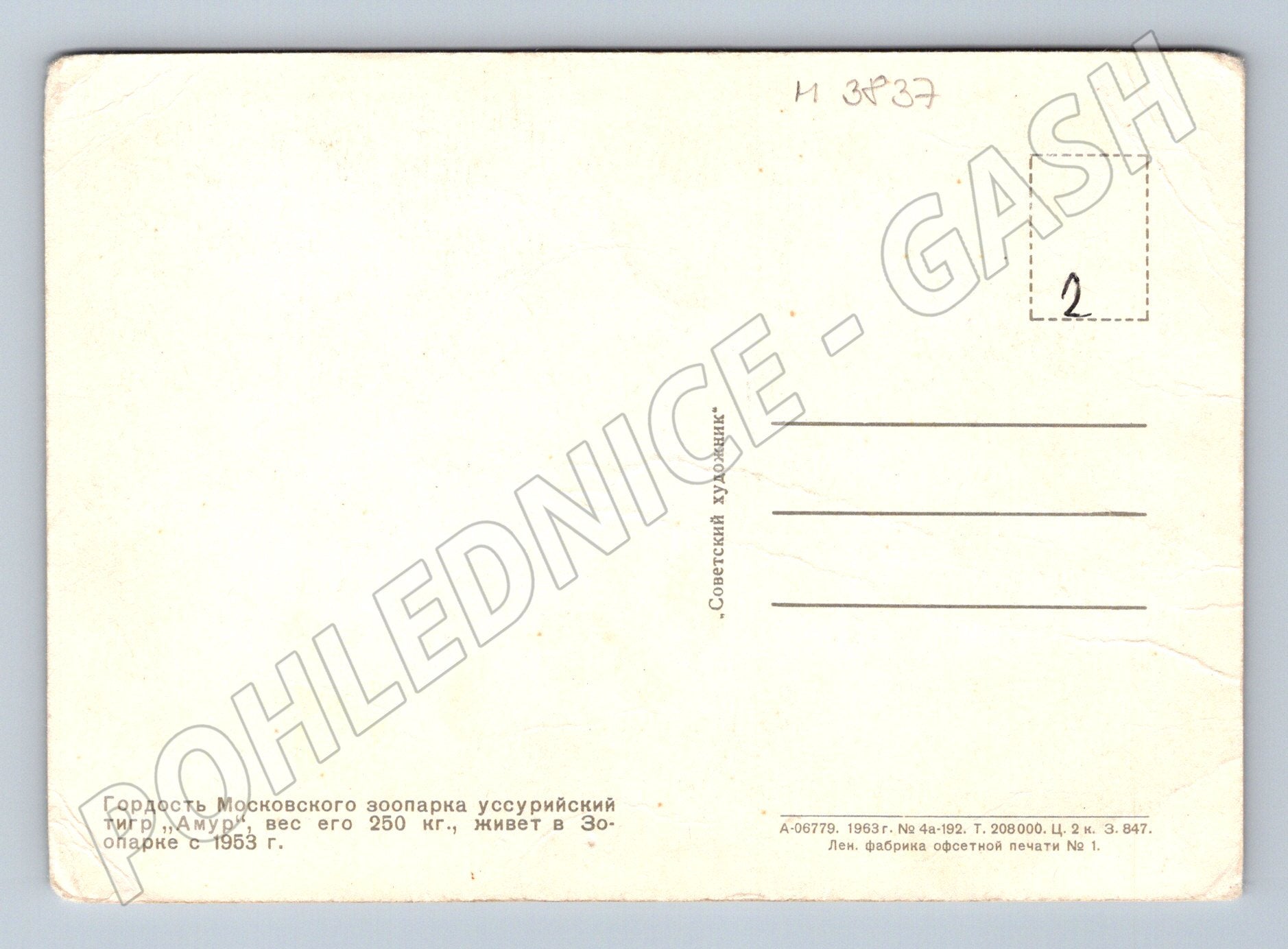 Originální pohlednice ze Sovětského svazu z roku 1963. Na přední straně je barevná fotografie ussurijského (amurského) tygra s informací, že se jedná o pýchu Moskevské zoologické zahrady. Tygr Amur zde žil od roku 1953 a jeho hmotnost byla 250 kg. Pohlednice nese známky stáří, mírně opotřebované rohy a drobné ohyby, jinak je však v dobrém sběratelském stavu. Zadní strana obsahuje popis v ruštině a je nepopsaná. Jedná se o zajímavý dobový sběratelský kousek pro milovníky zvířat či historických pohlednic.