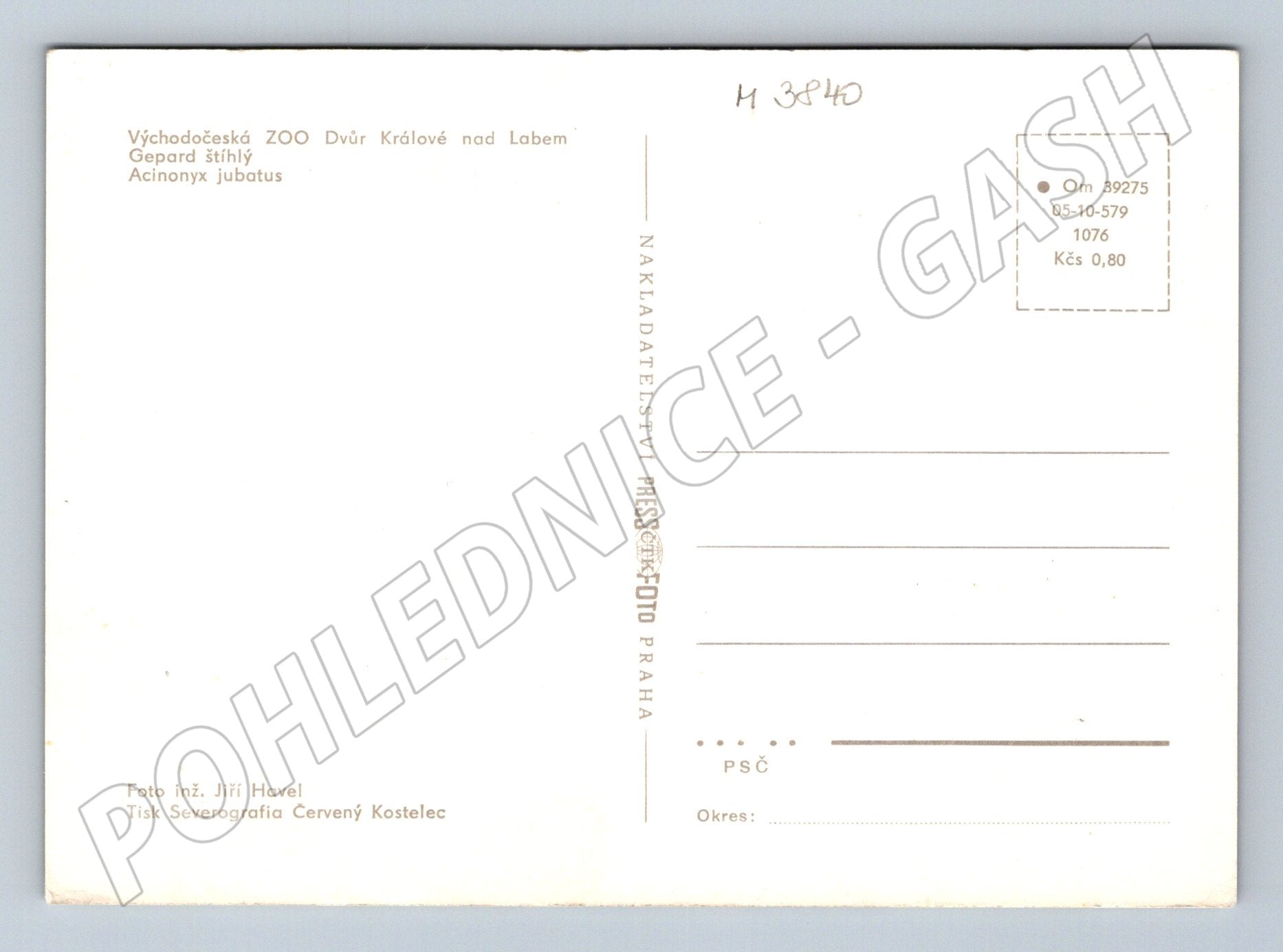 Originální pohlednice ze série vydané Východočeskou ZOO Dvůr Králové nad Labem. Na přední straně je barevná fotografie odpočívajících gepardů štíhlých (Acinonyx jubatus), autorem fotografie je inž. Jiří Havel. Zadní strana pohlednice obsahuje běžné kolonky pro adresu a vzkaz, cena pohlednice 0,80 Kčs. Zachovalý původní stav, vhodné pro sběratele nebo milovníky zvířat a přírody. Vydáno tiskem Severografia Červený Kostelec.