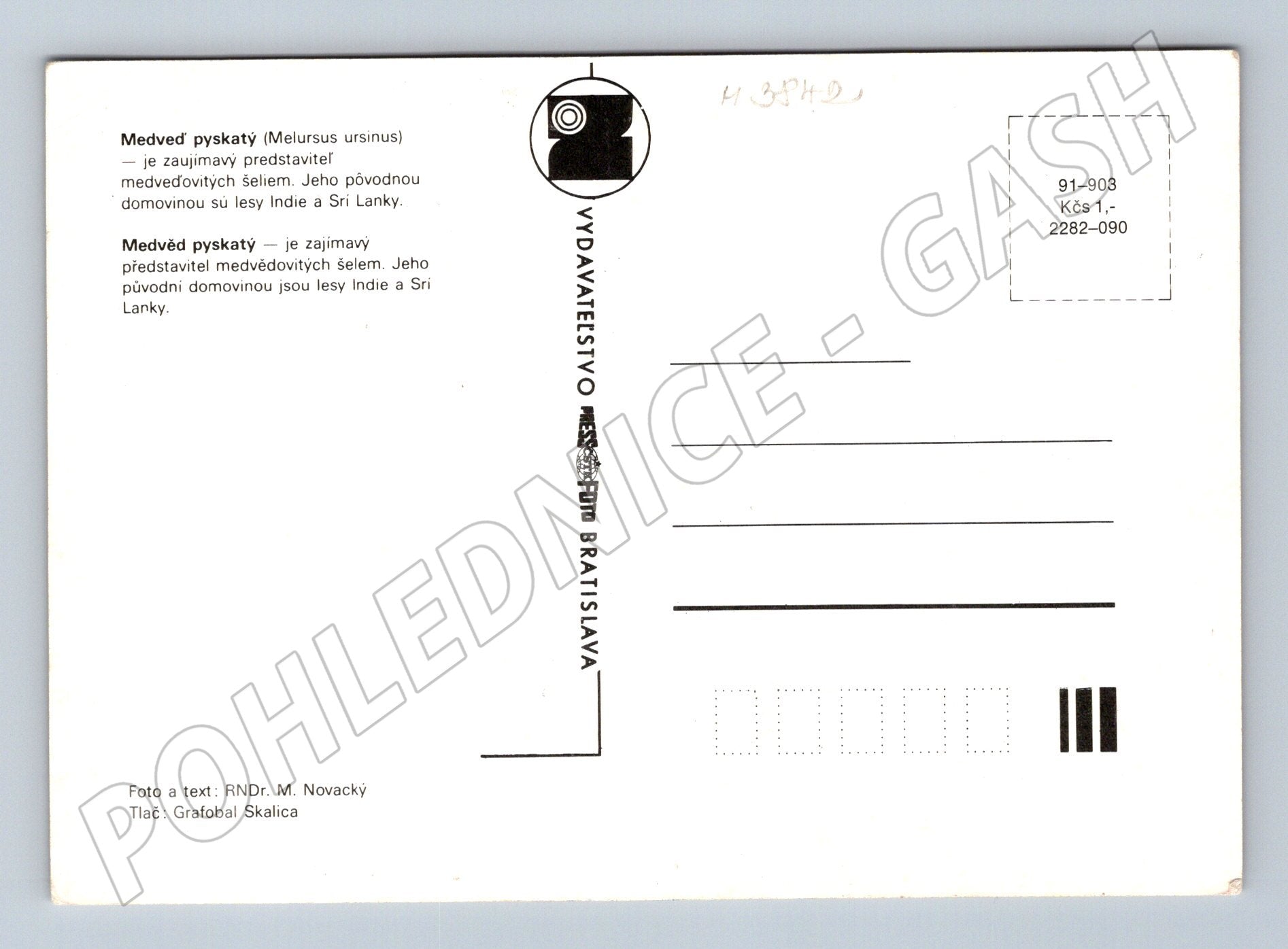 Nabízím originální pohlednici se zobrazením medvěda pyskatého (Melursus ursinus). Jedná se o zajímavého představitele medvědovitých šelem, jehož původní domovinou jsou lesy Indie a Srí Lanky. Pohlednice byla vydána vydavatelstvím Obzor Bratislava, autorem fotografie a textu je RNDr. M. Novacký, tisk Grafobal Skalica. Stav pohlednice viz foto, zachovalá, nepopsaná, vhodná do sbírky nebo jako dárek pro milovníky zvířat. Přibližný rok vydání první poloviny 90. let (viz označení 91-903).