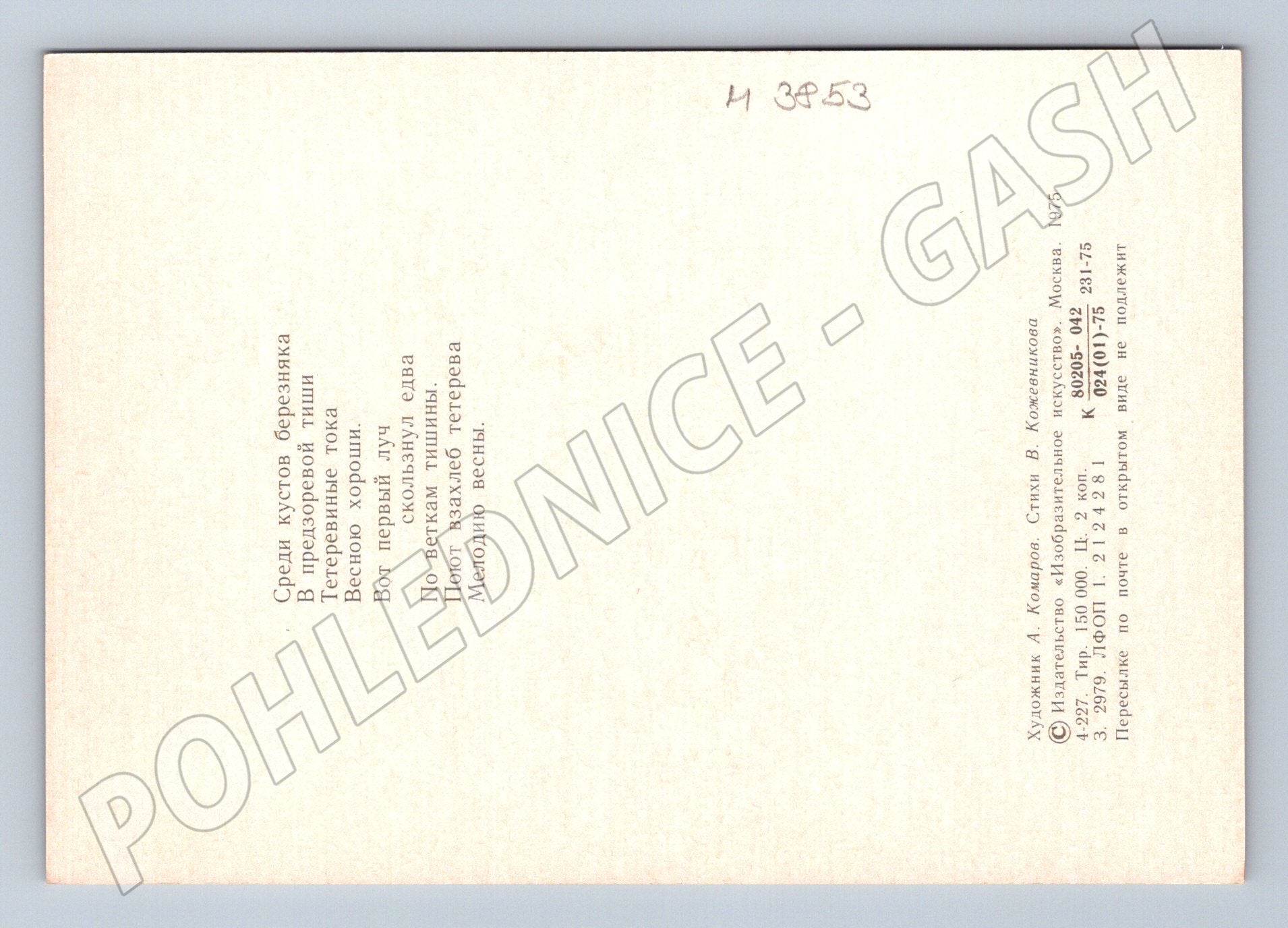 Pohlednice s barevnou ilustrací tetřeva v jarní krajině, od umělce A. Komarova, text básně V. Komeňikova. Pohlednice byla vydána v roce 1975 nakladatelstvím Изобразительное искусство, Moskva (Rusko/SSSR). Zadní strana obsahuje báseň v ruštině a vydavatelské údaje. Pohlednice je v dobrém stavu, bez popisu a známky. Vhodná pro sběratele pohlednic s motivem zvířat či ornitologie, nebo jako dekorativní předmět.