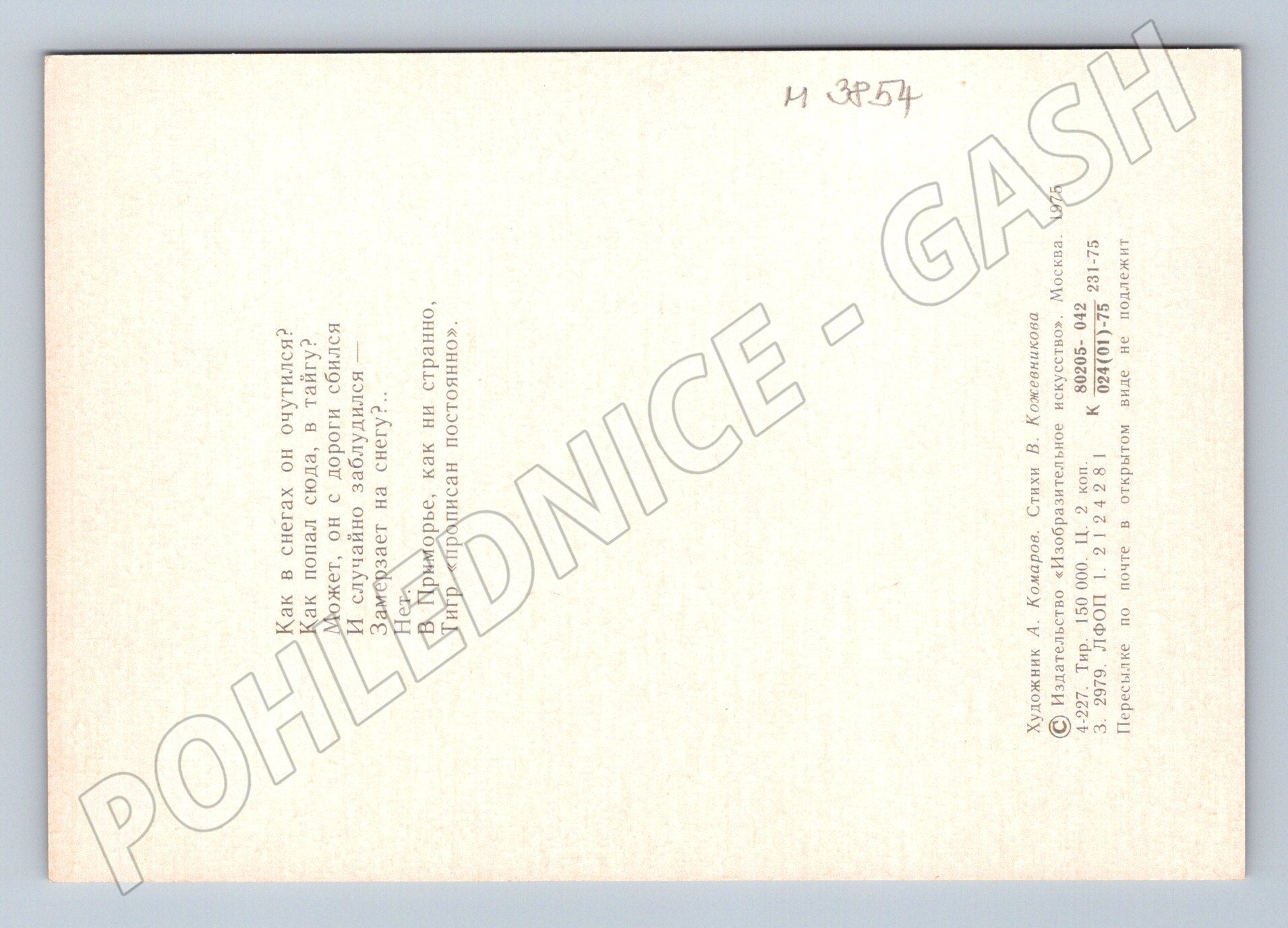 Nabízím sběratelskou pohlednici s motivem tygra ve sněhu od ruského malíře A. Komarova. Pohlednice byla vydána v roce 1975 nakladatelstvím Искусство (Moskva, SSSR). Na přední straně je malba tygra v zimní krajině, na zadní straně krátká báseň od V. Konevnikova a podrobnosti o vydání (v azbuce). Pohlednice je ve velmi dobrém stavu, neprošlá poštou, bez známky či popisu. Ideální pro sběratele zvířecích motivů, milovníky přírody nebo zájemce o sovětské pohlednice. Rozměr cca 14 x 10 cm. Krásná ilustrace z přírody Dálního východu.