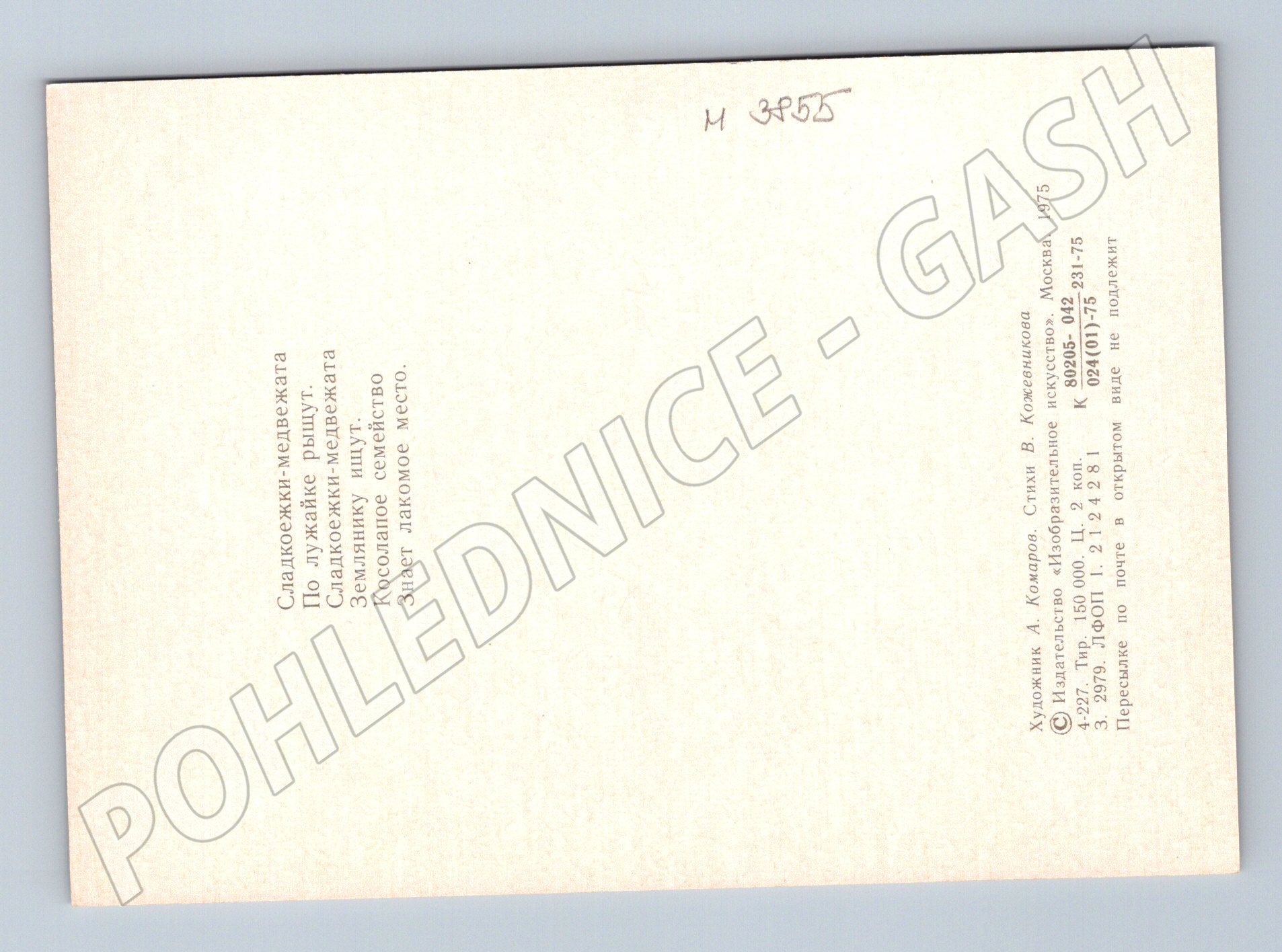 Nabízím sběratelskou pohlednici s motivem medvědice s medvíďaty na louce, kterou vytvořil malíř A. Komarov. Pohlednice pochází z roku 1975 a byla vydána v Moskvě nakladatelstvím Izobrazitělnovo iskusstva. Na zadní straně je báseň v ruštině. Pohlednice je ve velmi pěkném sběratelském stavu, čistá, nepopsaná a neprošlá poštou. Krásná ukázka sovětské zvířecí ilustrace vhodná do každé sbírky.