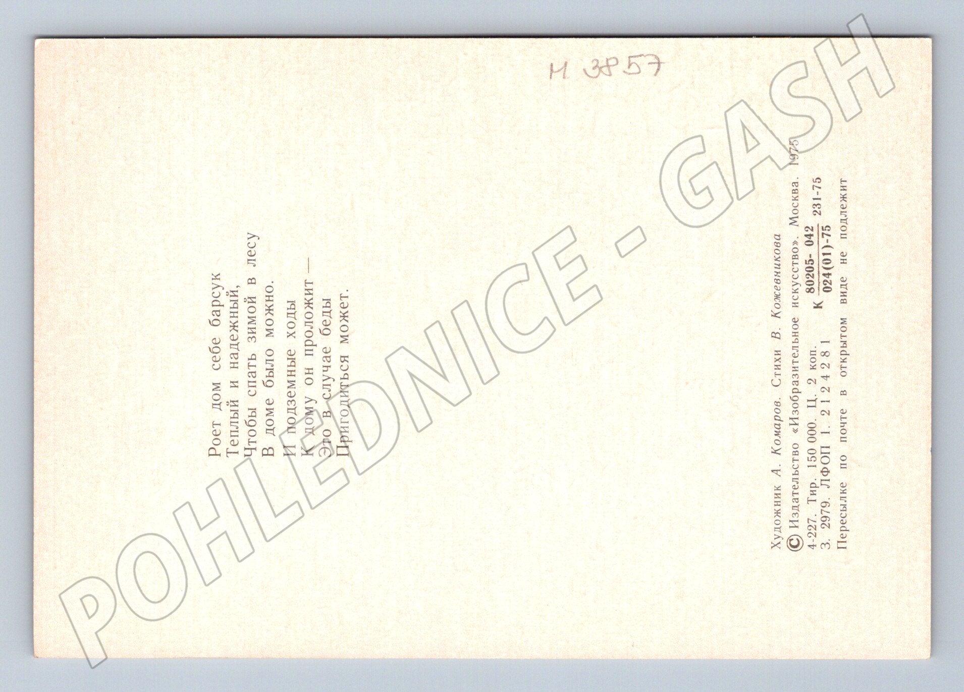 Nabízím sběratelskou pohlednici s motivem jezevců, která pochází z vydavatelství Изобразительное искусство v Moskvě (1975). Na přední straně je malba jezevců v jejich přírodním prostředí. Na zadní straně se nachází krátká báseň v ruštině od V. Konevnikova i informace o vydavateli, autorovi ilustrace (A. Komarov) a ročníku vydání. Pohlednice je v dobrém sběratelském stavu, čistá, nebyla nikdy odeslaná ani popsána. Krásný kousek do sbírky sovětských nebo zvířecích pohlednic.