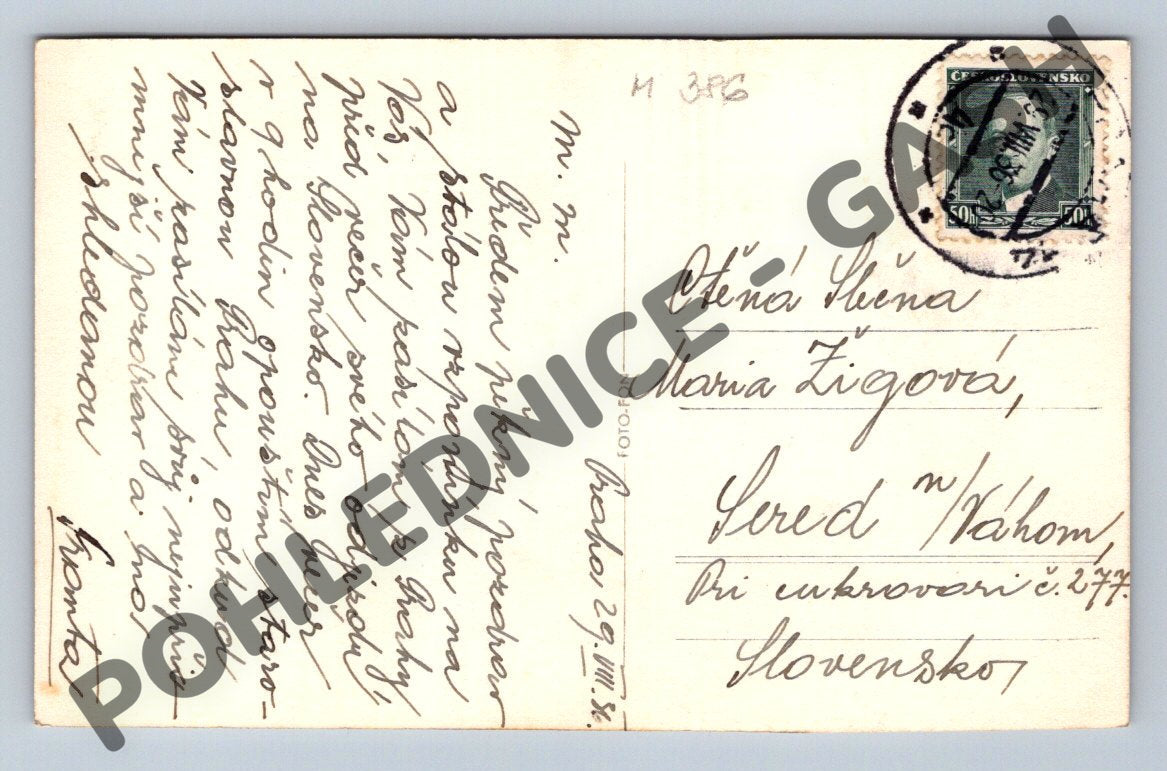 Historická pohlednice zobrazující ikonickou Pražskou katedrálu sv. Víta pohledem z Belvederu. Jedná se o černobílou pohlednici menšího formátu s popisem ve čtyřech jazycích (česky, německy, francouzsky a anglicky) na přední straně. Na rubu je dochované originální ručně psané pozdravení a původní poštovní známka s razítkem. Pohlednice byla zaslána z Prahy na Slovensko v první polovině 20. století. Atraktivní sběratelský kousek dokumentující pražskou architekturu i poštovní historii.