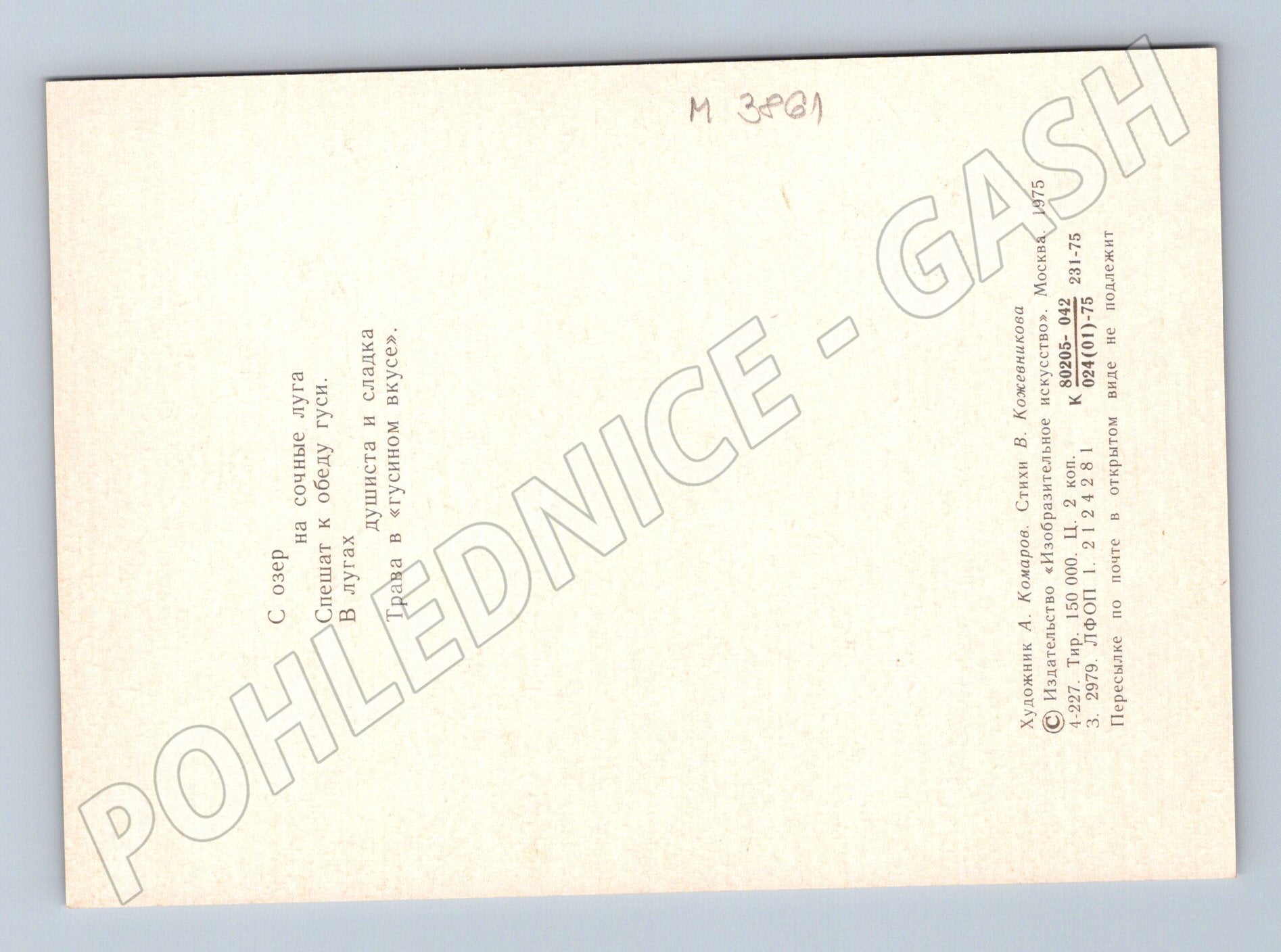 Nabízím sběratelskou pohlednici s malovaným motivem hus na louce, část hejna vzlétá za sluncem. Autorem ilustrace je A. Kokarev, tištěno v SSSR v roce 1975. Pohlednice je neprošlá, v pěkném, sběratelském stavu. Na zadní straně krátká báseň v ruštině a vydavatelské údaje, pohlednice formátu cca 15 x 10,5 cm. Skvělý kousek pro milovníky přírody, zvířat a historické korespondence.