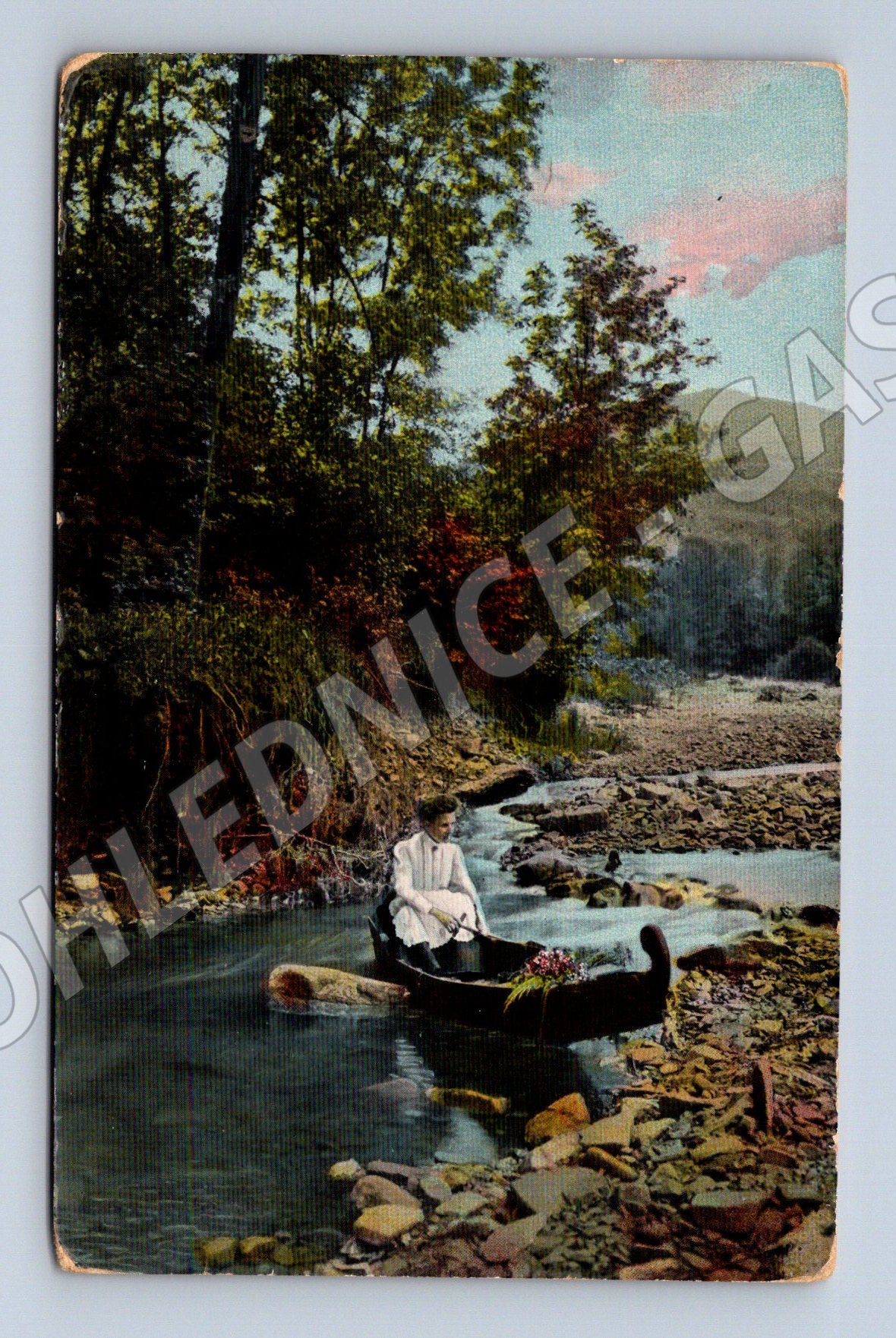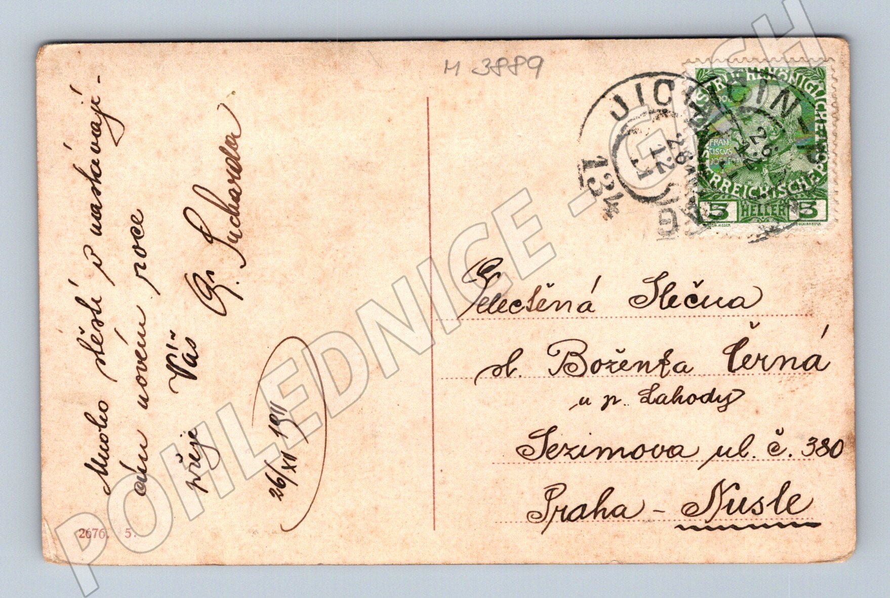 Starobylá pohlednice z roku 1911 zaslaná z Jičína do Prahy-Nuslí. Přední strana pohlednice zobrazuje barevně kolorovanou scenérii s dívkou v loďce na říčce v romantické přírodě, pravděpodobně z českého venkova. Na rubu najdete ručně psaný text, dobovou poštovní známku rakousko-uherské monarchie (5 hellerů) a čitelné poštovní razítko. Pohlednice je dobře zachovalá s drobnými známkami opotřebení na rozích, historicky a sběratelsky hodnotný kousek.