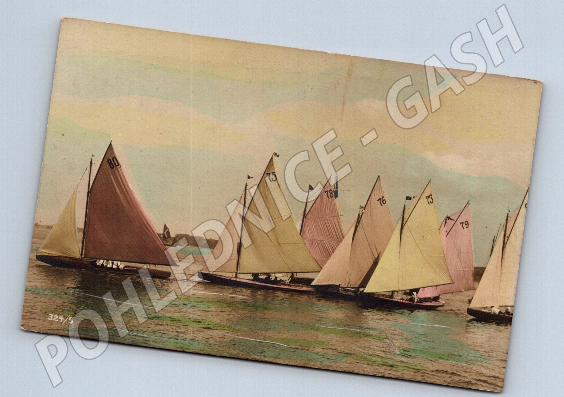 Originální stará pohlednice zobrazující plachetnice během závodu na klidné vodní hladině. Ručně kolorovaný tisk s dobovou atmosférou, pravděpodobně z první poloviny 20. století. Na pohlednici jsou detailně zachyceny elegantní plachetnice s očíslovanými plachtami (80, 78, 76, 75, 79), posádky na palubě a klidná krajina v pozadí. Pohlednice je ve slušném sběratelském stavu, s drobnými známkami stáří – viz sken. Zadní strana neprošlá poštou, čistá, vhodná pro sběratele námořní nebo lodní tematiky.