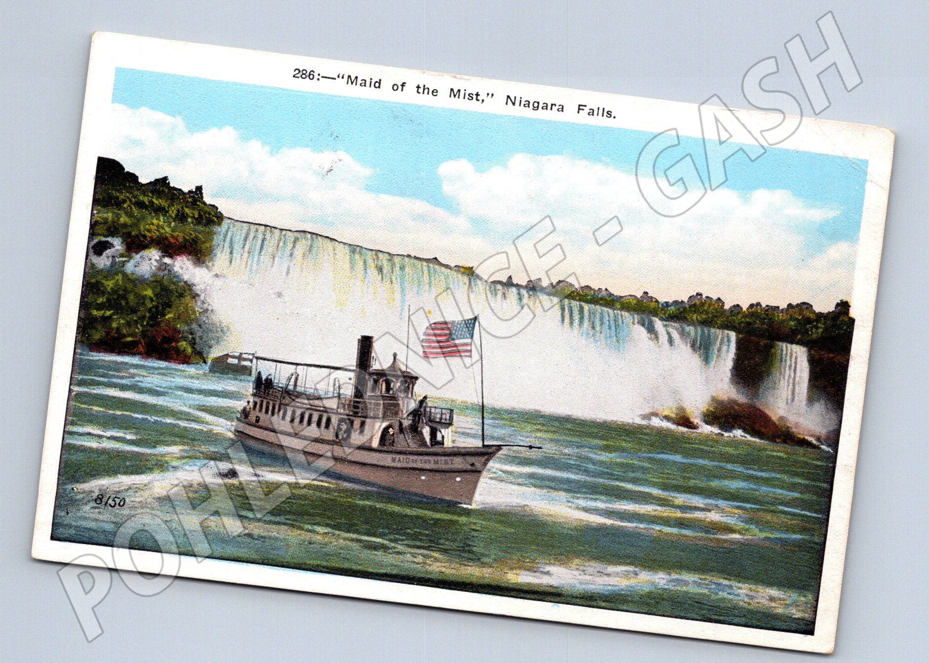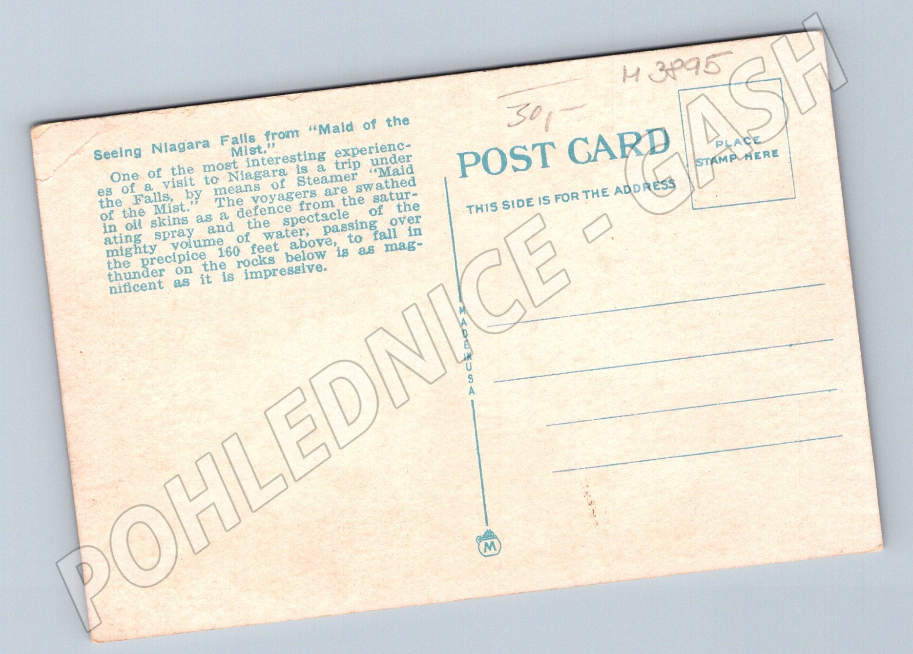 Originální stará pohlednice zobrazující loď „Maid of the Mist“ plující podél Niagarských vodopádů. Pohlednice zachycuje typickou scénu s parníkem a americkou vlajkou, na pozadí s majestátními vodopády. Na zadní straně pohlednice je tištěný popis: „Jedním z nejzajímavějších zážitků při návštěvě Niagary je plavba parníkem ‘Maid of the Mist’. Cestující jsou chráněni olejovými plášti před silným postřikem a mohou pozorovat mohutný proud vody, který padá z výšky 160 stop na balvany pod vodopády. Tento zážitek je nádherný i působivý.“ Pohlednice je neprošlá poštou, je v pěkném sběratelském stavu, bez nápisů. Ideální pro sběratele pohlednic s tématem vodní dopravy a známých světových lokalit.