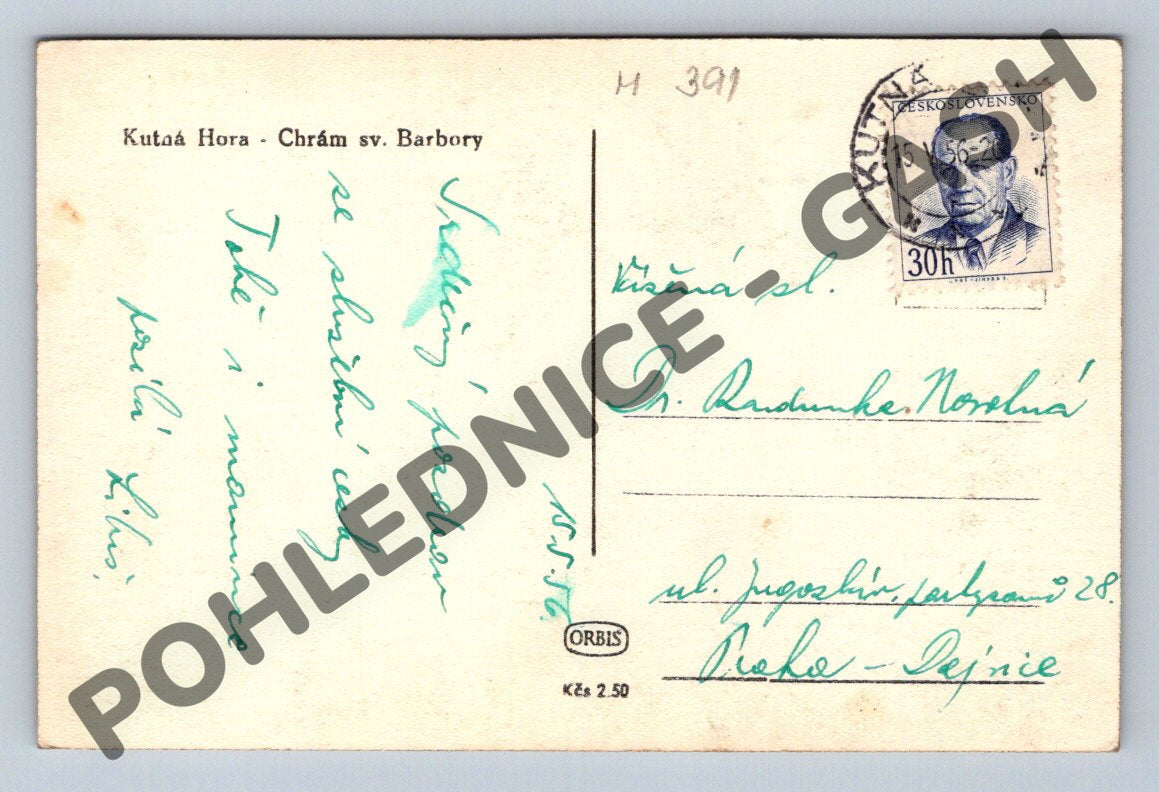 Originální stará pohlednice s motivem chrámu sv. Barbory v Kutné Hoře. Jedná se o klasický turistický námět, typický pro české památkově chráněné stavby. Pohlednice je již použita, opatřena razítkem a známkou z období Československa. Zadní strana obsahuje ručně psaný vzkaz a adresu adresáta. Na přední straně najdeme černobílou fotografii chrámu v pozadí s bohatou vegetací v popředí. Vhodné pro sběratele historických pohlednic nebo milovníky architektury a památek.