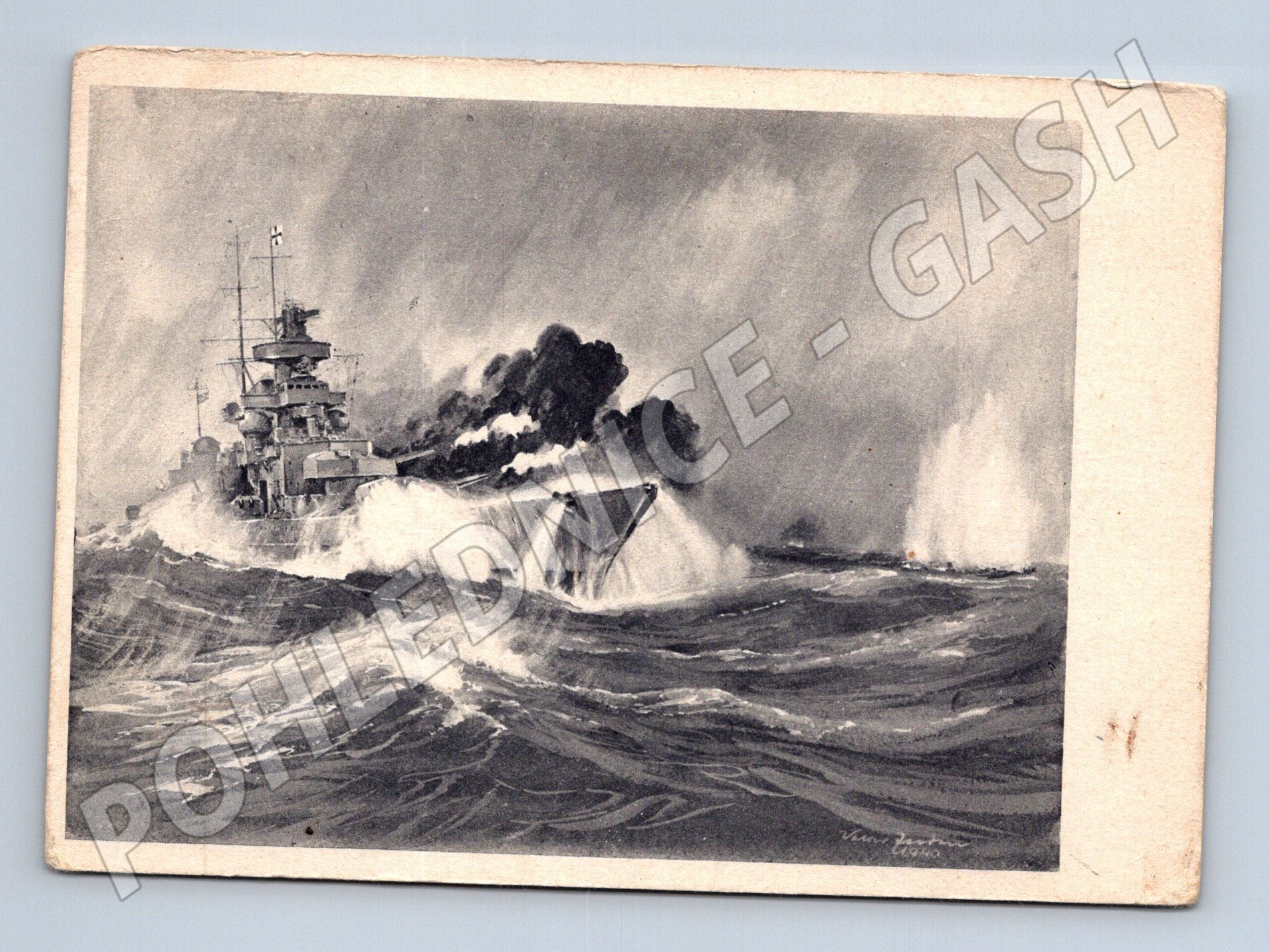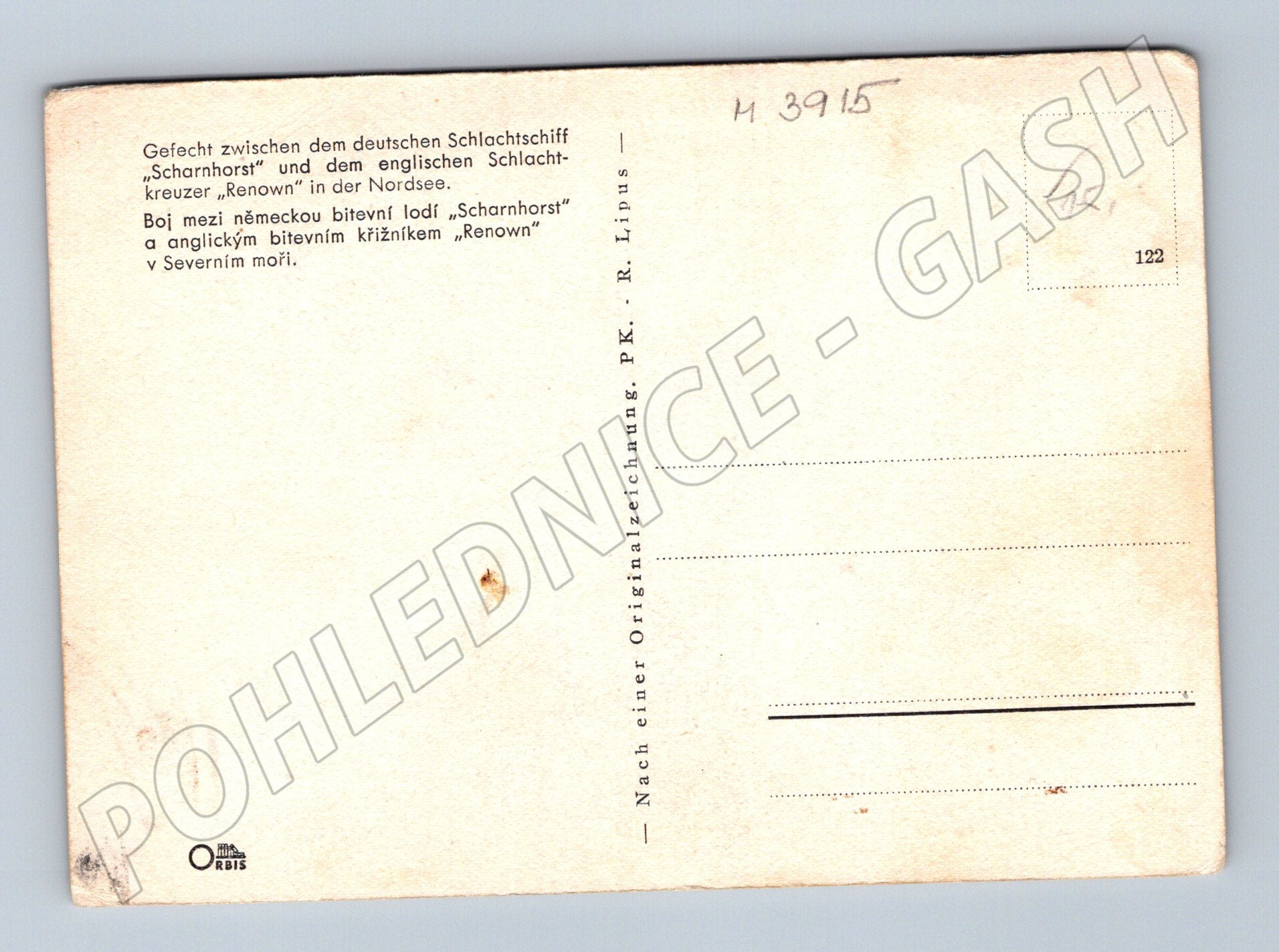Nabízím sběratelskou pohlednici s motivem bitvy mezi německou bitevní lodí Scharnhorst a anglickým bitevním křižníkem Renown v Severním moři během druhé světové války. Pohlednice je reprodukcí originální kresby, pravděpodobně z 40. let 20. století. Na přední straně je zobrazen dramatický námořní boj, na zadní straně německý a český popis scény. Stav pohlednice odpovídá stáří, mírné opotřebení rohů, bez známky poštovního odeslání. Ideální doplněk do sbírky válečných, námořních či historických pohlednic.