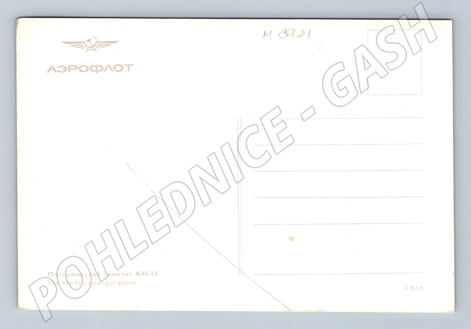 Nabízím originální pohlednici s vyobrazením sovětského dopravního letadla Antonov An-14. Pohlednice pochází z období SSSR, je na ní patrná značka CCCP a nápis Aeroflot. Na zadní straně najdete nápis v ruštině, angličtině a hodnotu 2 kopějky. Pohlednice je v pěkném stavu, vhodná pro sběratele letecké tematiky, pohlednic z období SSSR, zájemce o dopravní letadla či sběratele historických pohlednic. Rozměr klasický, tisk barevný. Skvělý přírůstek do sbírky!